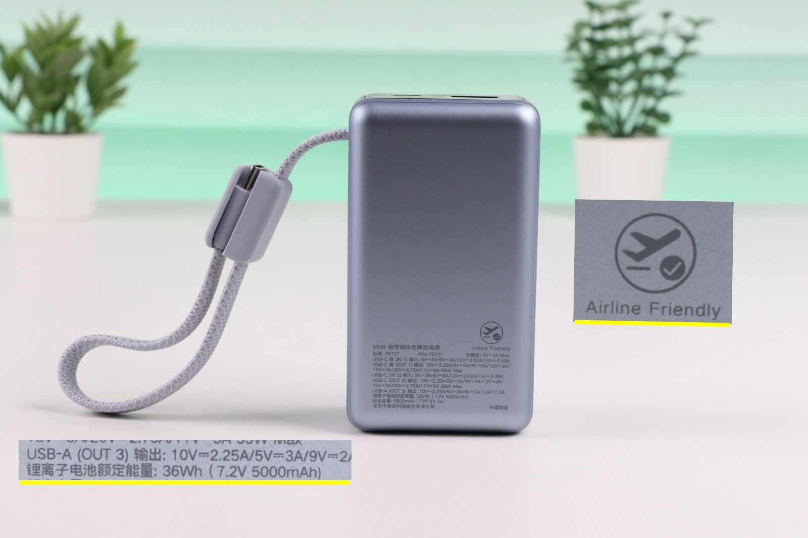 机身背后,有Airline Friendly的标识,这表明绿联能量湃 Pro的设计和规格符合航空公司的携带要求,尤其是在国际航空运输中。其额定能量36Wh,低于航司/铁路携带标准100Wh。