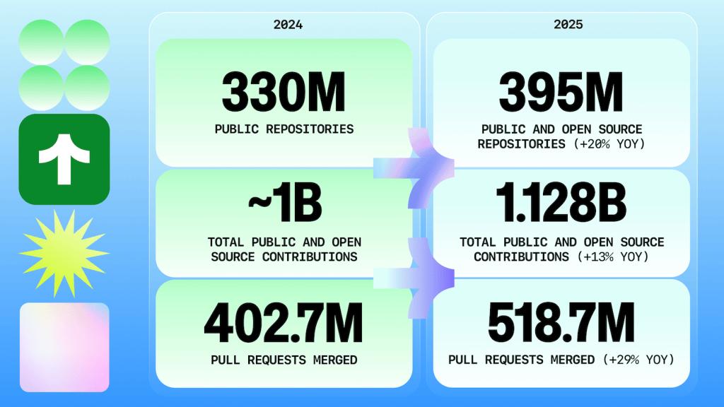 今年,开源开发活动达到了创纪录的水平,公共仓库的贡献总量达到了 11.2 亿次(同比增长 13%)。2025 年 3 月是 GitHub 历史上新增开源贡献者数量最多的一个月。