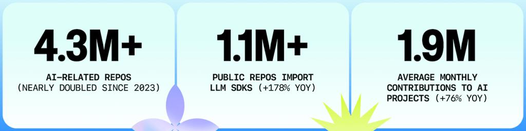 生成式 AI 正日益成为基础设施。现在有超过 110 万个公开仓库导入了 LLM SDK(同比增长 178%,对比 2025 年 8 月与 2024 年 8 月),由超过 105 万名贡献者支持,月度提交量(monthly commits)达到 175 万次(自 2023 年以来增长了 4.8 倍)。