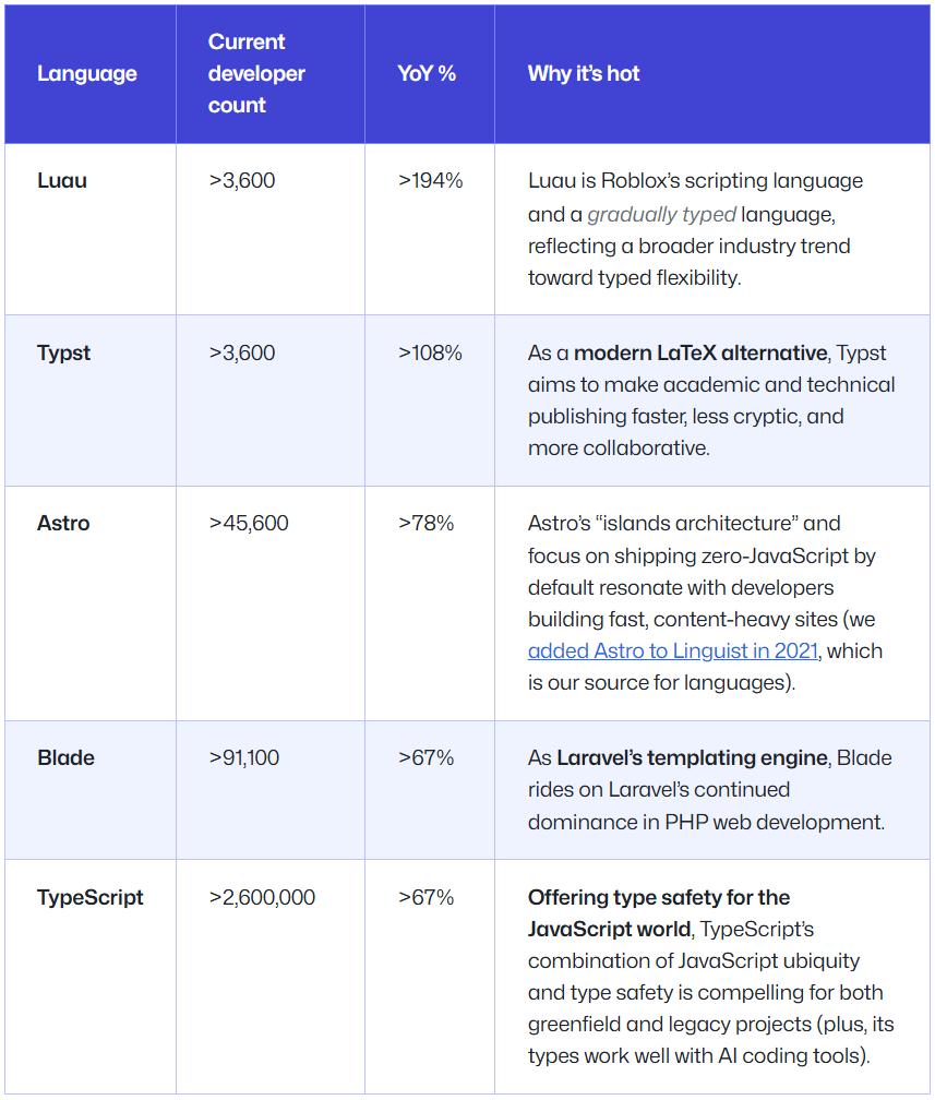 增长最快的语言是 Luau。Luau 是 Roblox 的脚本语言,也是一个逐步类型化的语言,体现了整个行业向「类型灵活性」发展的趋势。