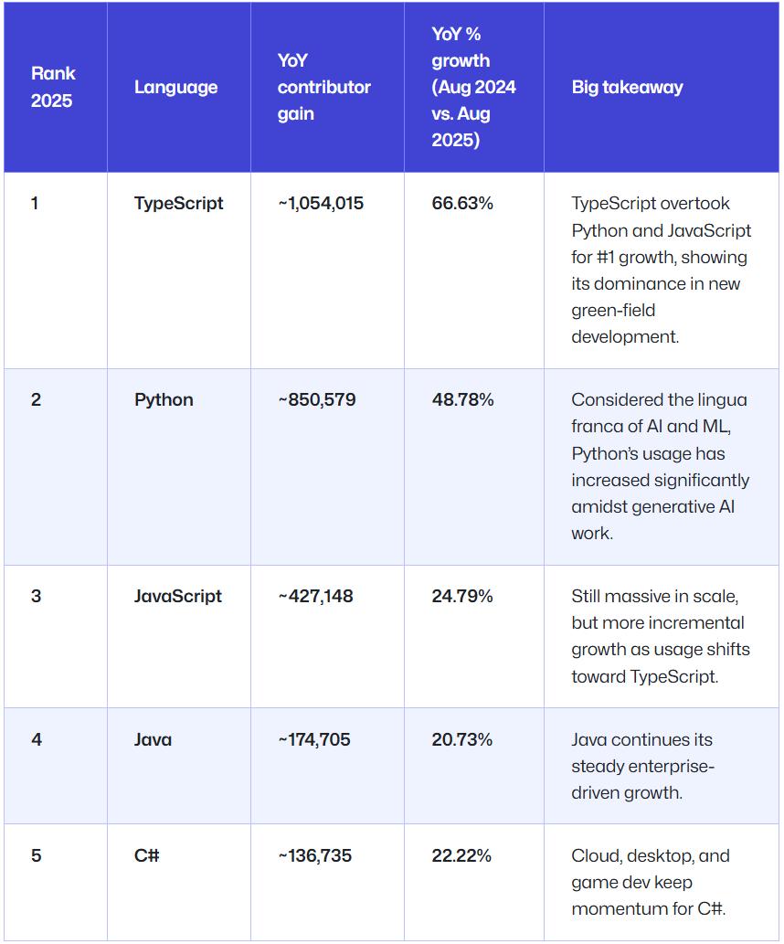 GitHub 报告表示:「这一里程碑事件是过去十年来开发者转向类型化 JavaScript (typed JavaScript)趋势的集中体现,也标志着 TypeScript 正在成为现代开发的新默认选项。」