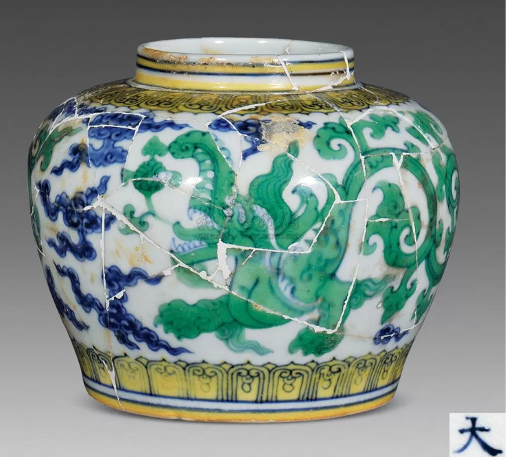依考古出土物研究,本器所属类别更为复杂,需经三次入窑乃成:高温烧制青花,中温烧制黄、绿彩,低温烧制矾红彩。矾红彩烧成温度范围非常有限,温度过高则影响已经烧成的黄、绿彩,温度过低则矾红彩难以达到要求,烧制难度极高,烧成与否,全凭窑工经验,故成化时期带有矾红彩的斗彩瓷器成品率极低。不少出土物上黄绿彩鲜亮如新,矾红彩则脱落大半。每次出窑,都要经严格筛选,仅是稍有呈色不佳,即打碎掩埋。最终三轮皆无瑕疵者,方可留存。稍有不慎,则功亏一篑。