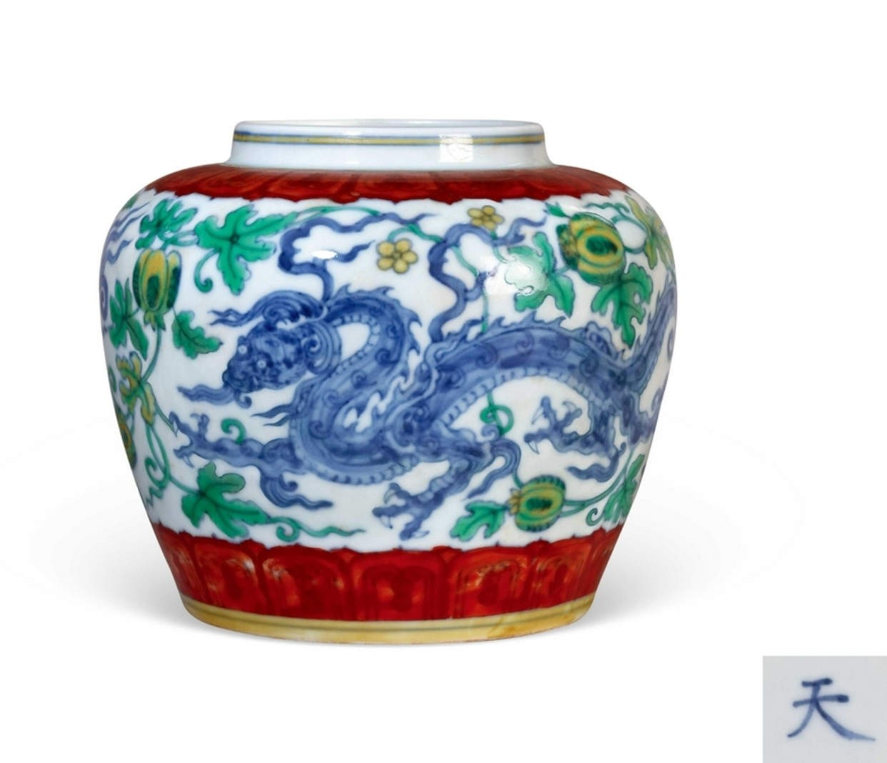 本器圆口丰肩,腹部浑圆,线条张弛有度,外壁满绘青花夔龙纹,独角四足,卷草尾,三爪锋利,点缀以缠枝瓜果纹,造型俊逸,分别以黄、绿、红彩点染瓜果、枝叶及上下莲瓣,黄绿相间,清新明丽。青花发色纯美淡雅,外底以圆润中锋运笔,藏锋写出“天”字款,大字楷体,笔画遒劲挺拔,这一款识及书体贯穿成化始终,为明代一绝。以瓜藤入瓷绘,永乐时期见有青花大盘,瓜瓞连绵,硕果累累,象征物阜民丰,有为百姓祈求五谷丰登、安居乐业的美好愿望。见以斗彩绘者,似始于成化,与此件作品相类者十分稀见。