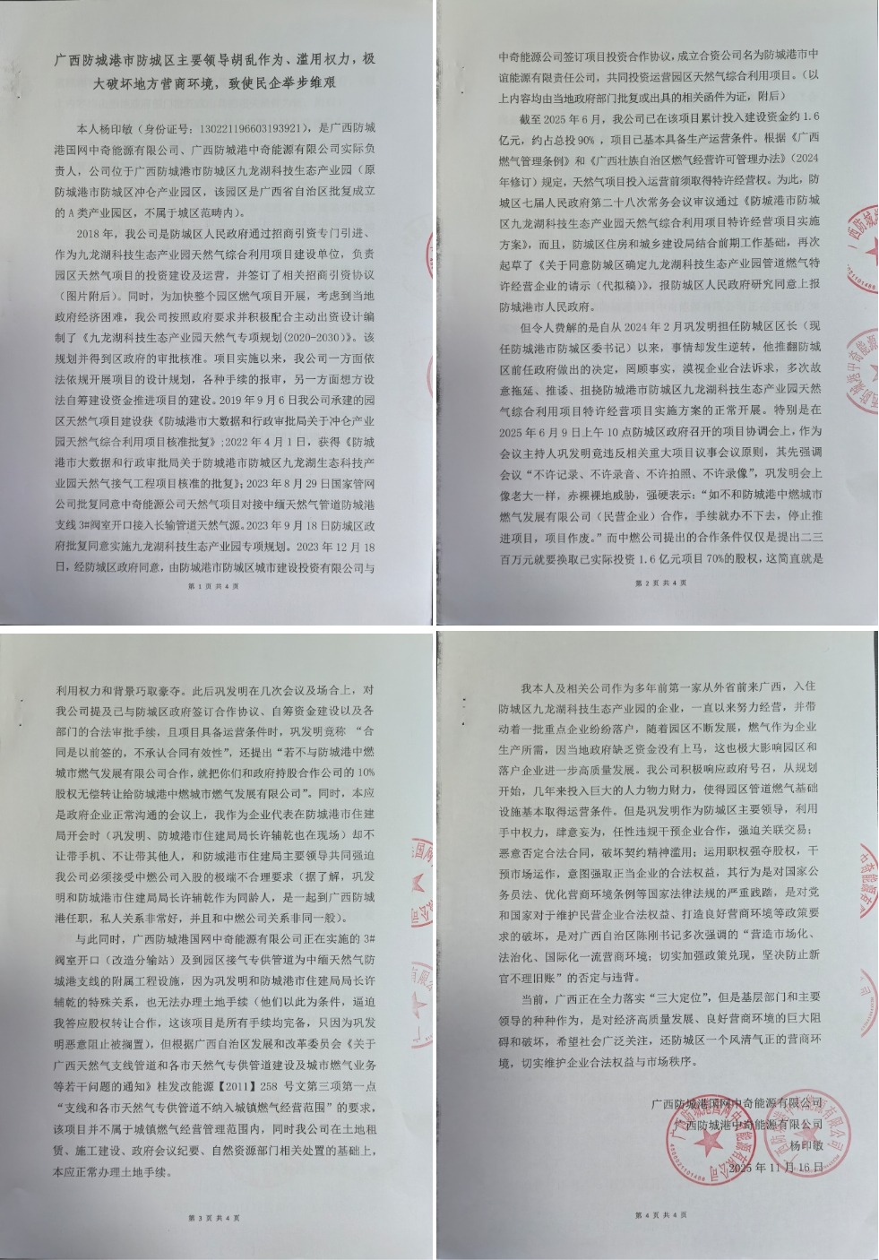 我本人及相关公司作为多年前第一家从外省前来广西,入住防城区九龙湖科技生态产业园的企业,一直以来努力经营,并带动着一批重点企业纷纷落户,随着园区不断发展,燃气作为企业生产所需,因当地政府缺乏资金没有上马,这也极大影响园区和落户企业进一步高质量发展。我公司积极响应政府号召,从规划开始,几年来投入巨大的人力物力财力,使得园区管道燃气基础设施基本取得运营条件。但是巩发明作为防城区主要领导,利用手中权力,肆意妄为,任性违规干预企业合作,强迫关联交易;恶意否定合法合同,破坏契约精神滥用;运用职权强夺股权,干预市场运作,意图强取正当企业的合法权益,其行为是对国家公务员法、优化营商环境条例等国家法律法规的严重践踏,是对党和国家对于维护民营企业合法权益、打造良好营商环境等政策要求的破坏,是对广西自治区陈刚书记多次强调的“营造市场化、法治化、国际化一流营商环境;切实加强政策兑现,坚决防止新官不理旧账”的否定与违背。