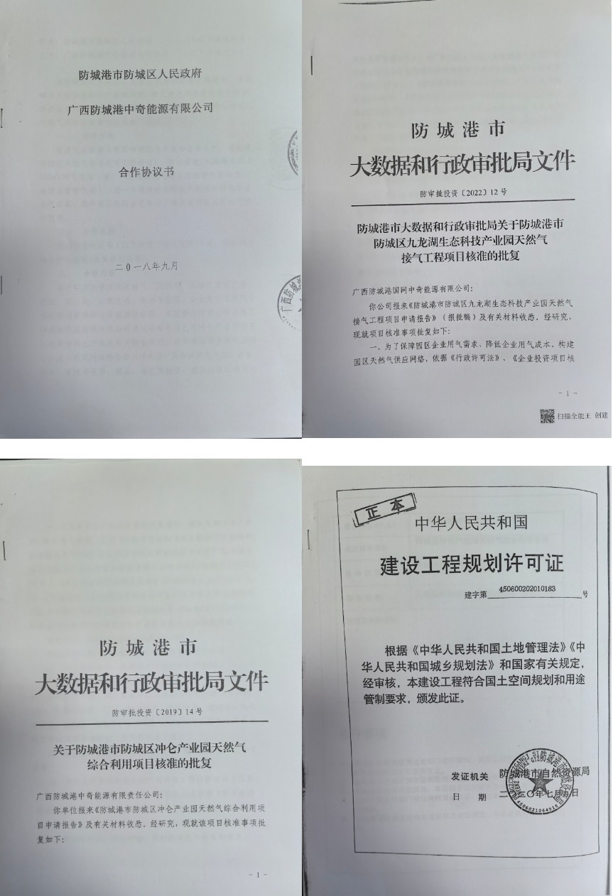 2018年,我公司是防城区人民政府通过招商引资专门引进、作为九龙湖科技生态产业园天然气综合利用项目建设单位,负责园区天然气项目的投资建设及运营,并签订了相关招商引资协议(图片附后)。同时,为加快整个园区燃气项目开展,考虑到当地政府经济困难,我公司按照政府要求并积极配合主动出资设计编制了《九龙湖科技生态产业园天然气专项规划(2020-2030)》。该规划并得到区政府的审批核准。项目实施以来,我公司一方面依法依规开展项目的设计规划,各种手续的报审,另一方面想方设法自筹建设资金开展项目的建设。2019年9月6日我公司承建的园区天然气项目建设获《防城港市大数据和行政审批局关于冲仑产业园天然气综合利用项目核准批复》;2022年4月1日,获得《防城港市大数据和行政审批局关于防城港市防城区九龙湖生态科技产业园天然气接气工程项目核准的批复》;2023年8月29日国家管网公司批复同意中奇能源公司天然气项目对接中缅天然气管道防城港支线3#阀室开口接入长输管道天然气源。2023年9月18日防城区政府批复同意实施九龙湖科技生态产业园专项规划。2023年12月18日,经防城区政府同意,由防城港市防城区城市建设投资有限公司与中奇能源公司签订项目投资合作协议,成立合资公司名为防城港市中谊能源有限责任公司,共同投资运营园区天然气综合利用项目。(以上内容均由当地政府部门批复或出具的相关函件为证,附后)