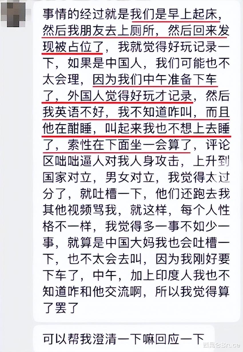 当事人称,她在火车上完厕所返回时,发现自己的铺位被一名外籍男子占据。由于语言不通且对方看似入睡,她未强行唤醒,转而录制视频讲述经历。