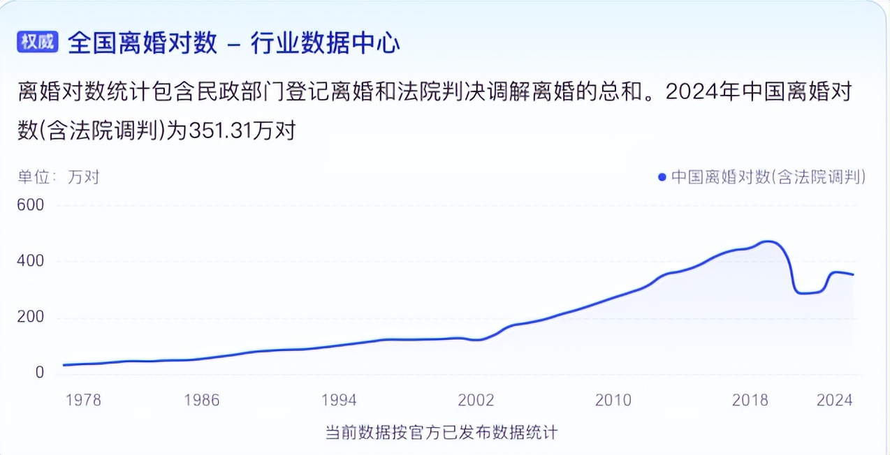 除此之外,离婚率的上升,也加剧了男女双方对结婚这件事的忧虑。2024年,全国离婚对数高达351万,尽管这个数字含法院调判,但仍然非常夸张。