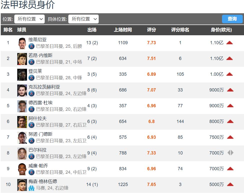 法甲球员最新身价榜top10:身价排名前9的球员均来自巴黎俱乐部,除了维蒂尼亚、若昂-内维斯、登贝莱三大亿欧先生之外,克瓦拉茨赫利亚和杜埃的身价也高达9000万欧元,他们分别是24岁和20岁,依然有涨球空间,或许下一次更新他们的身价也有望突破亿欧先生行列。