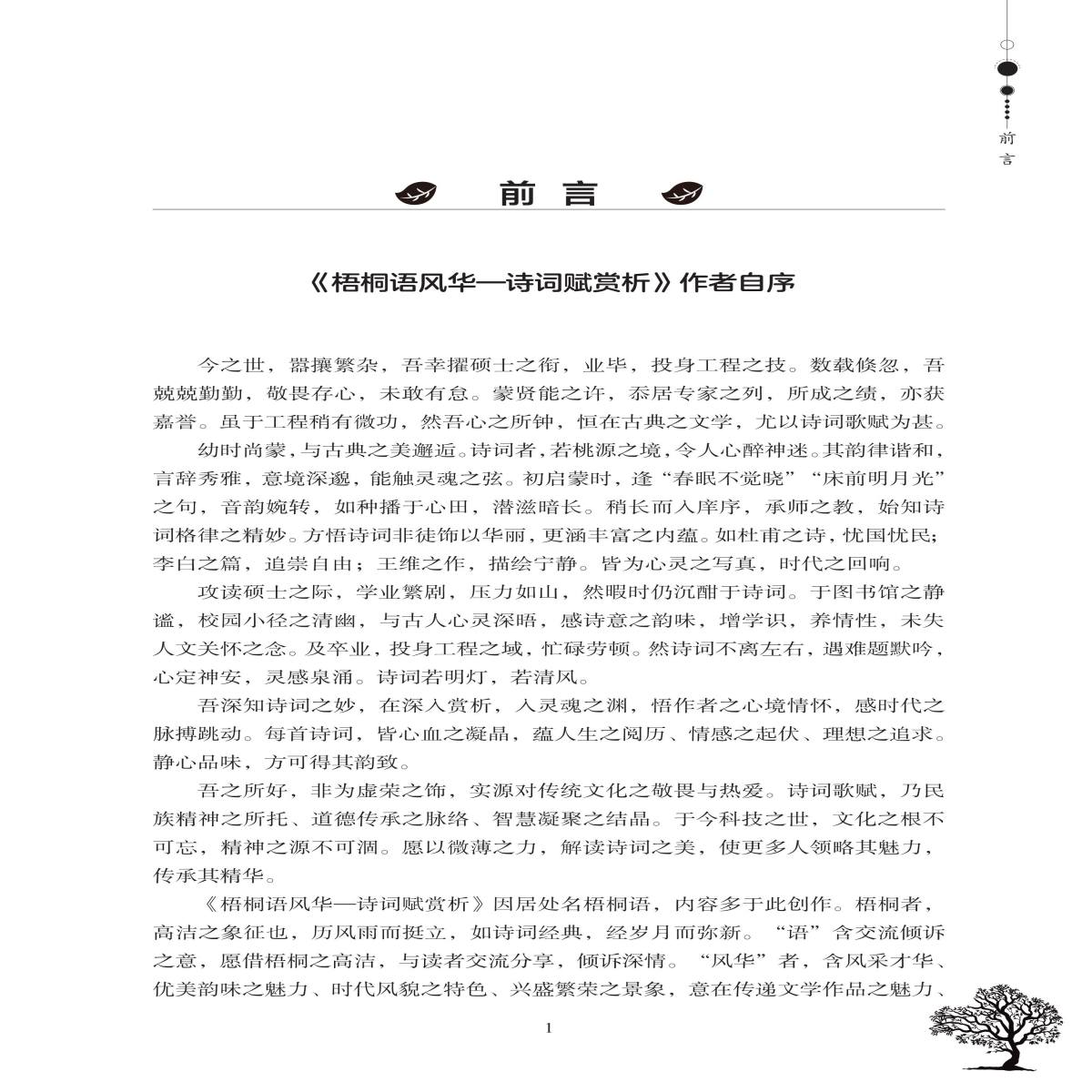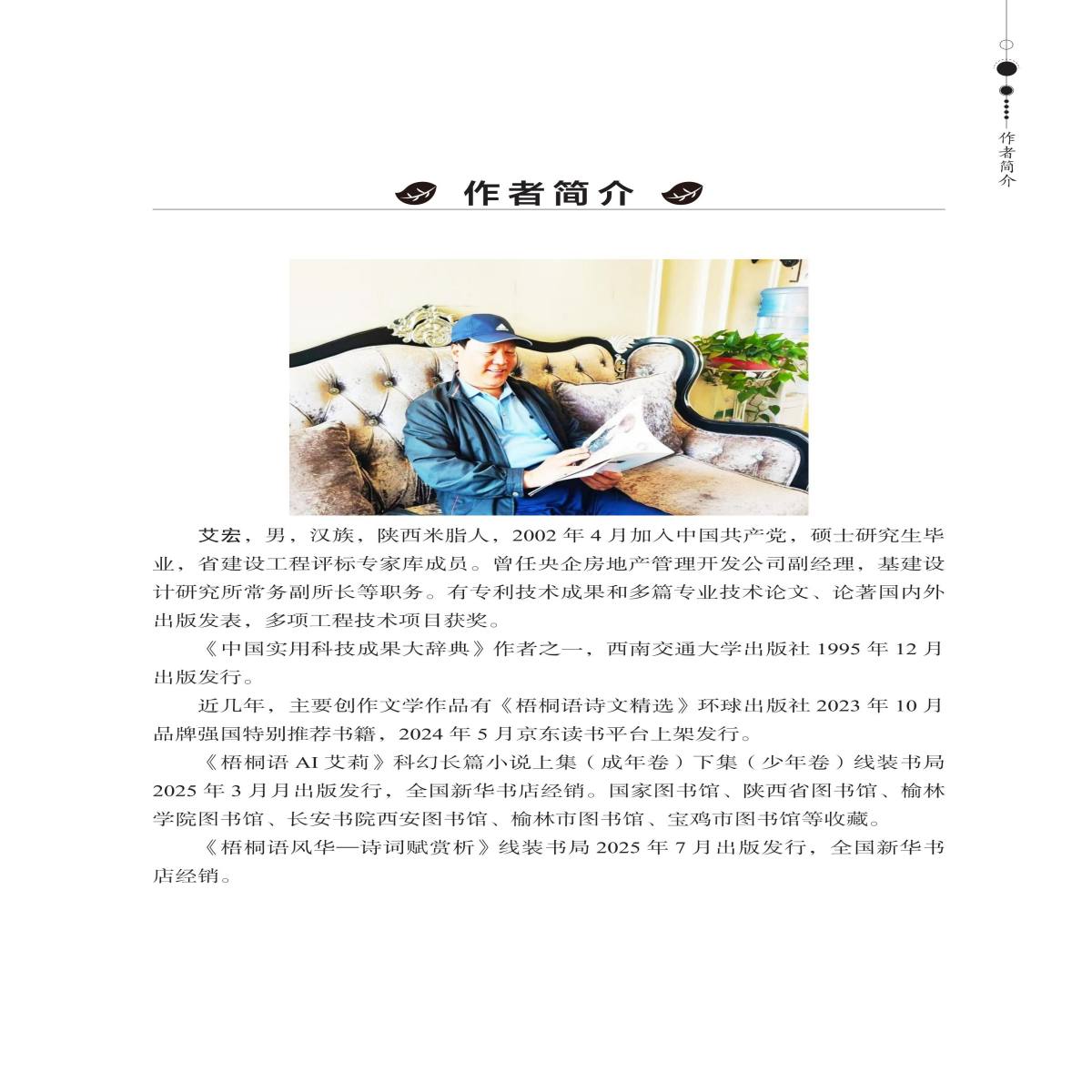 作者艾宏身份多重——央企工程师、省建设工程专家、科幻小说家,却在梧桐掩映的书斋中孕育出百余篇诗词赋。他将科技理性的严谨与文学感性的浪漫熔于一炉,如同书中描绘的梧桐"春迎暖日添新翠,秋送寒风卸旧妆",既有工程师的缜密思维,又有文人的细腻笔触。这种跨界视角让古典诗词赏析焕发新意,书中对苏轼《赤壁赋》的解读竟巧妙关联现代物理学"熵增理论",令人耳目一新。