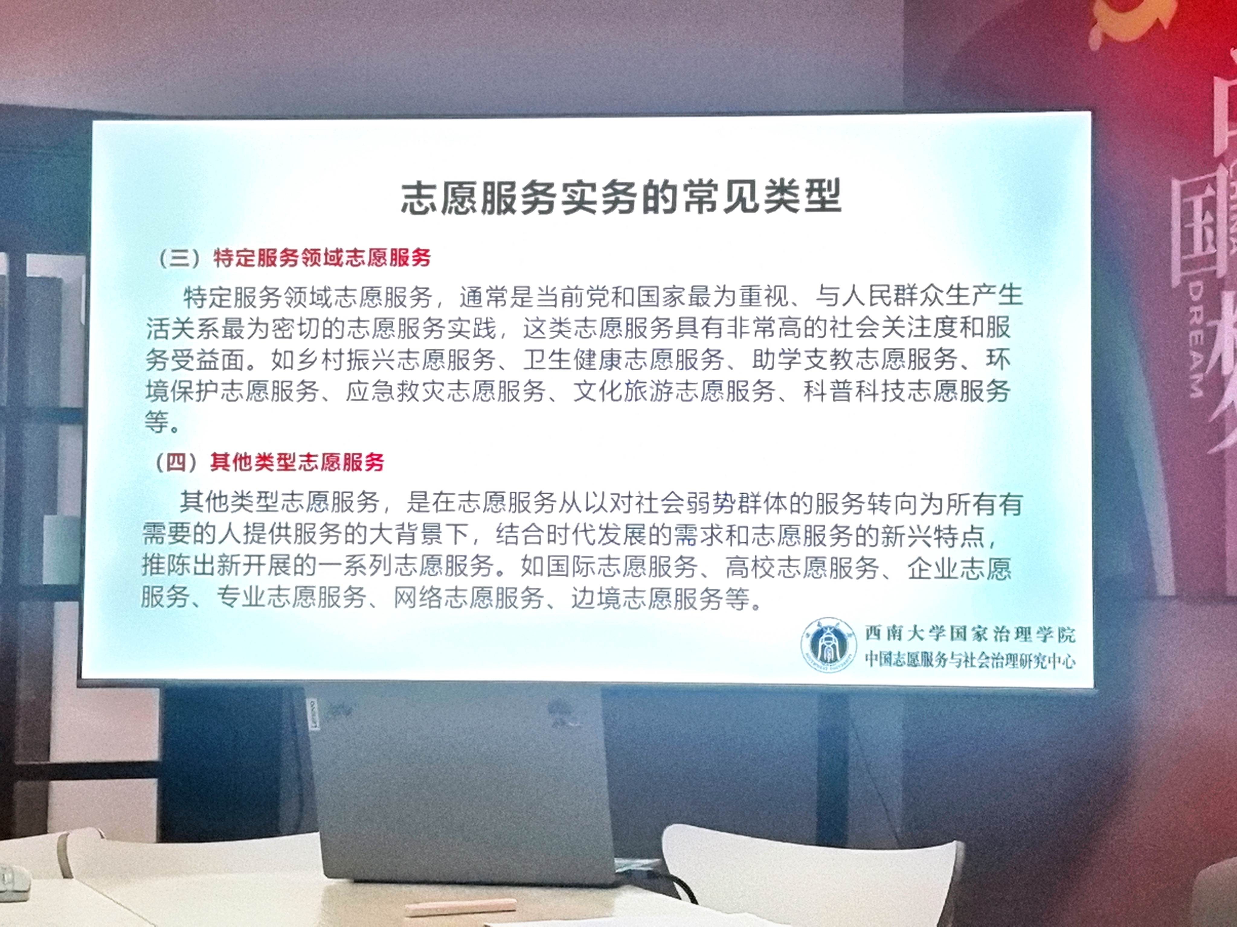 解志愿核心,分服务领域。培训伊始,西南大学周林波教授深入解读志愿理念,理清核心要素与概念边界。教授指出,志愿服务需依托时间、知识、技能、体力四大维度,灵活运用优势,方能保障服务实效。针对公益、慈善与支援的混淆点,教授细致辨析:公益聚焦大众、推公共利益,慈善帮扶特定困难群体,志愿是不以营利为目的的利他行为,三者差异显著,需准确理解以精准服务。此外,教授还梳理志愿服务类型:特殊群体志愿服务、特定场所志愿服务等,这不仅增进了志愿者们对志愿精神的理解,更指引着他们将这份理解有效落实到服务社会的具体行动中。