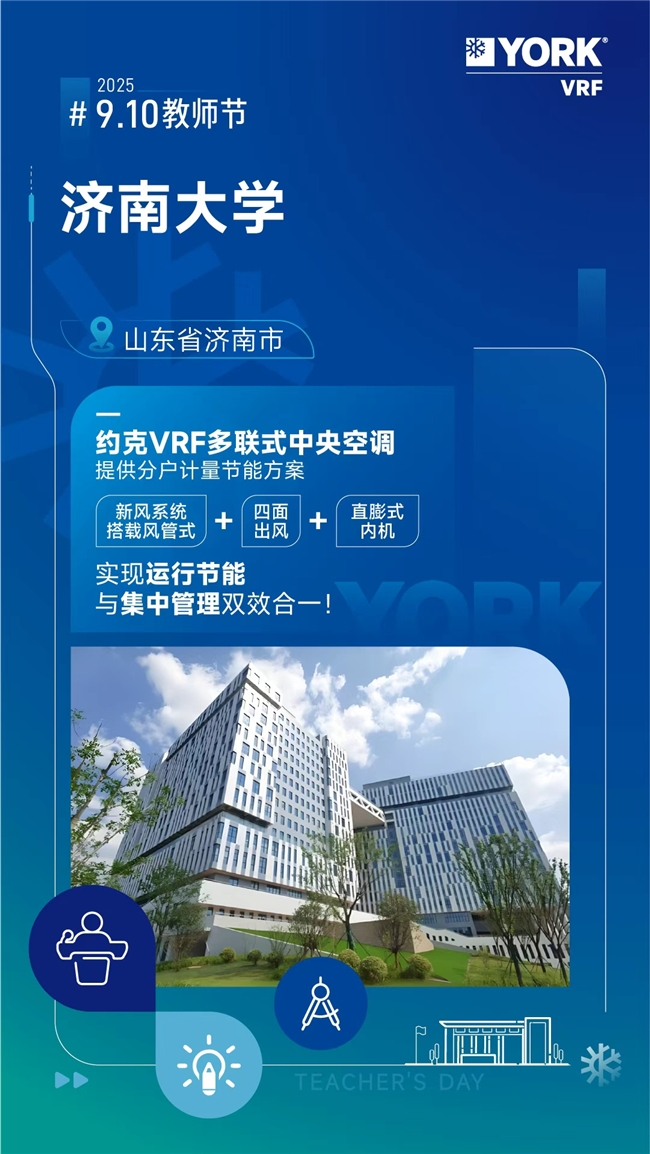 高校后勤对“节能与管理效率”的重视,在济南大学的空调中体现得淋漓尽致。约克 VRF 多联式中央空调提供“新风系统搭载风管式+四面出风+直膨式内机”的分户计量节能方案 :新风系统保障空气清新,多种内机形式适配不同建筑空间;分户计量功能则让每栋楼、每个区域的空调能耗清晰可查,实现运行节能与集中管理双效合一。