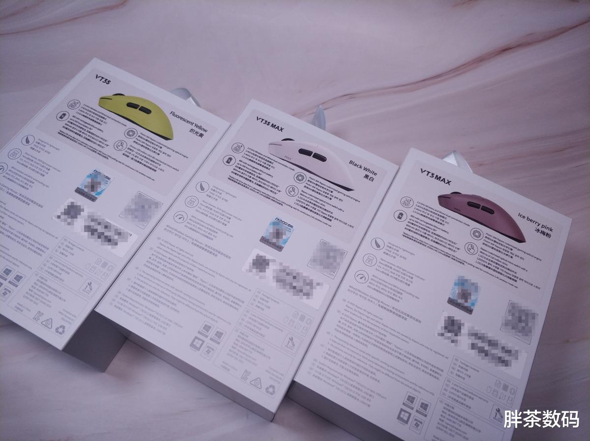 雷柏VT3&VT3s系列鼠标的外包装简洁美观,正面有比较醒目的logo标识图,背面有相应的名称型号和外观图。由左到右依次是炽光黄的VT3s、皎月白的VT3s MAX和冰莓粉的VT3 MAX。