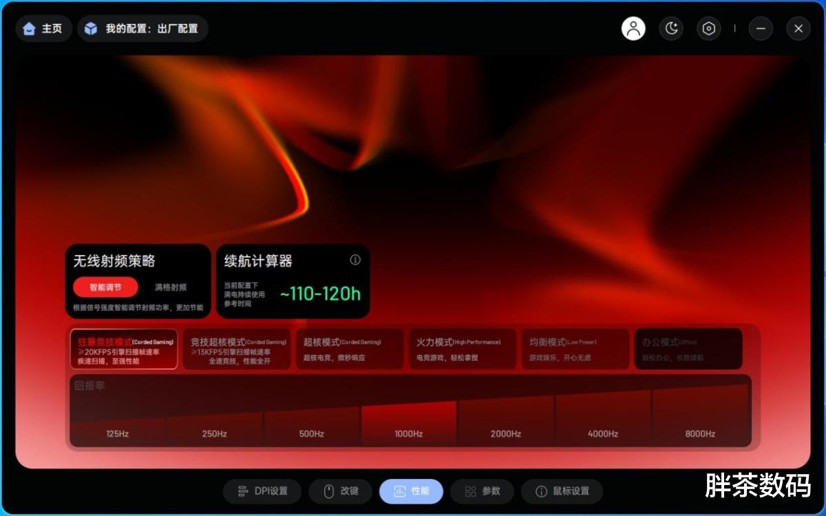 在驱动软件上可以设置鼠标的回报率、DPI、Windows指针速度、滚轮速度、按键功能等一系列内容。而在性能界面玩家可以设置自己的专属电竞模式,提供有狂暴竞技模式(可以让鼠标引擎的扫描帧速率达到超20000FPS)、竞技超核模式、超核模式、火力模式、均衡模式、办公模式等可选,玩家可以根据需求从性能到续航随意切换。