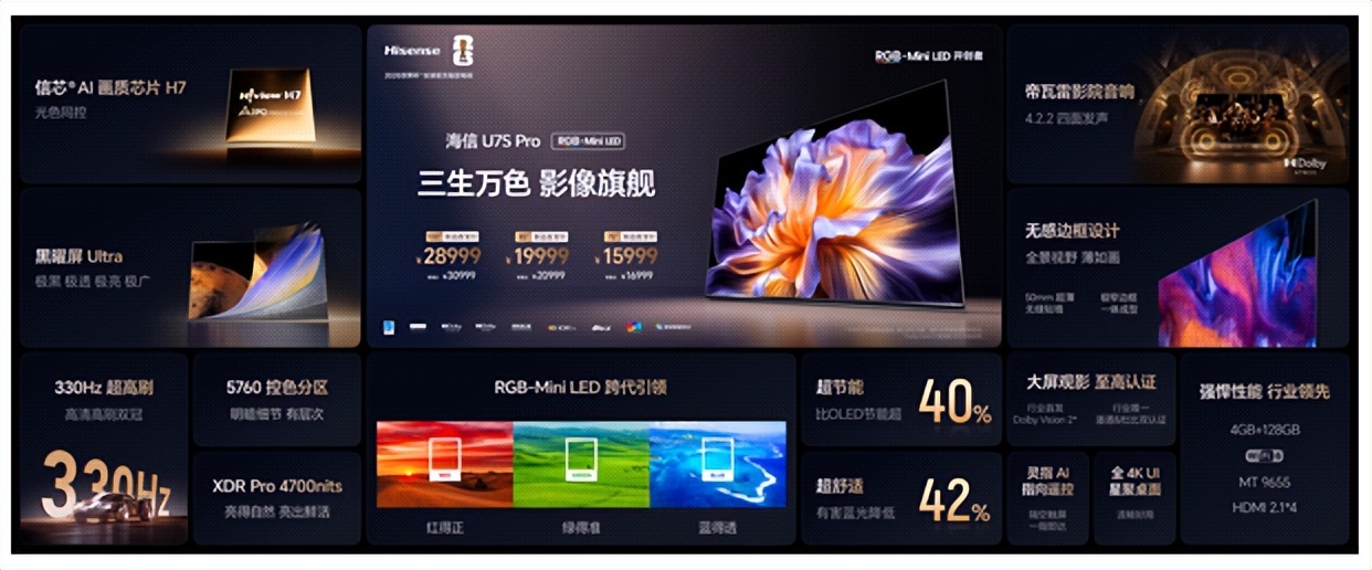 海信显示事业部预研与技术管理中心总经理王烨东介绍,通过RGB-Mini LED发光芯片、信芯AI画质芯片H7的核心算法升级进一步解封硬件性能,“影像旗舰”U7S Pro延续了海信RGB-Mini LED的全部技术优势,实现了100%BT.2020高色域、100%超高色彩纯度、超高亮度、超广视角、超低能耗等出色表现。U7S Pro融合了海信畅销全球75国U7系列的爆品基因,被业内誉为“2025年最值得买的RGB-Mini LED电视”。