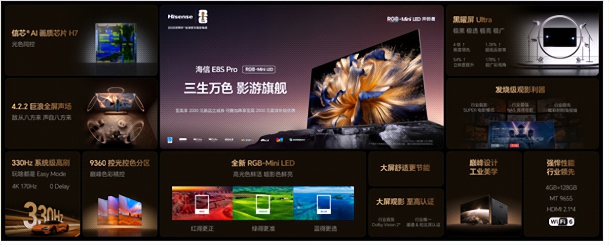 同场发布的“影游旗舰”海信E8S Pro专为追求极致体验的影游玩家打造,“王炸双芯”与黑曜屏Ultra双重加持,9360控光控色分区,实现巅峰色彩精控。海信E8S Pro支持行业最高的4K 170Hz原生刷新率和行业最强0 delay背光技术,动态场景表现出色。同时,海信E8S Pro将行业首发Super电影模式、支持炫彩刮削海报墙和游戏定制模式,是影游玩家的必入装备。