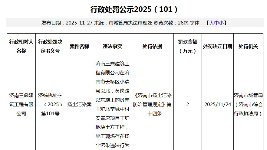 据行政处罚公示2025(101)了解:济南三鼎建筑工程有限公司在济南市天桥区小清河以北,黄岗路以东施工的济南王炉北辛城中村安置房项目王炉地块土方工程,施工现场存在扬尘污染违法行为。