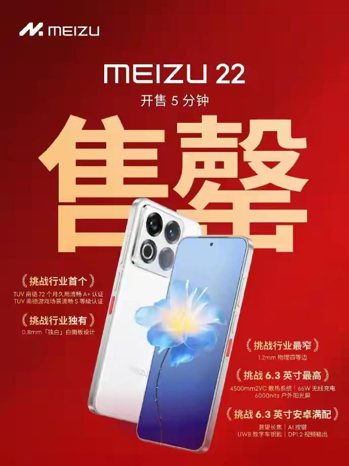当天发布完后就上市开卖,官方表示:魅族22上市首战告捷,开售 5 分钟,陆续售罄中。短短5分钟就卖完了,看似不错,但具体销量又没说,也不知道实际卖出去了多少,但预计应该是不多的。