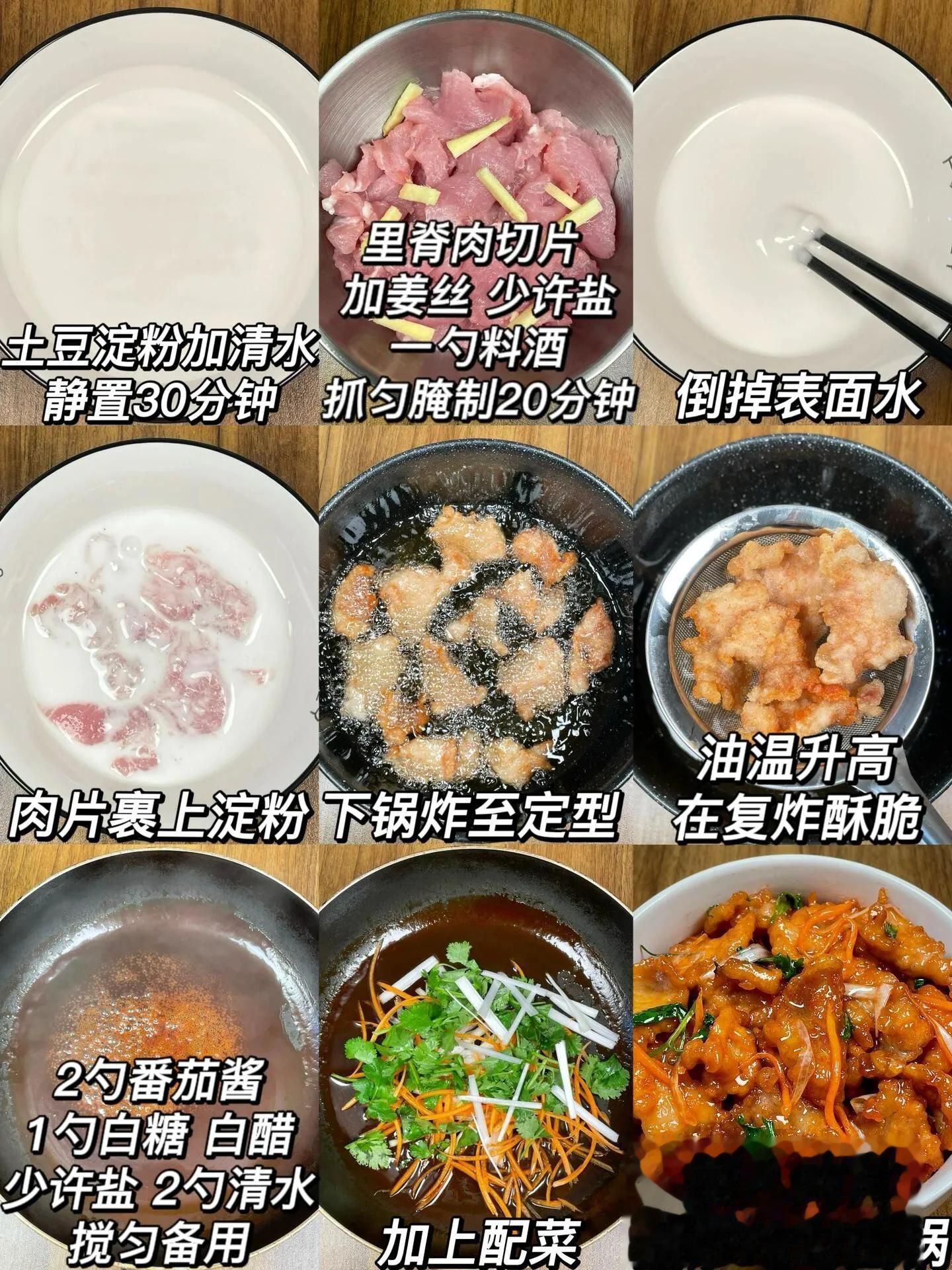 做家常锅包肉,食材准备超简单:猪里脊肉300克、土豆淀粉60克、胡萝卜半根、青椒半个、葱丝姜丝各少许,调料就是白糖、陈醋、生抽、盐和清水。先处理肉,把里脊肉切成0.3厘米厚的片,太厚不容易炸透,太薄又会失去外酥里嫩的口感。切好的肉片用清水冲一遍,挤干水分,加少许盐和料酒抓匀腌制10分钟,这样肉会更入味。