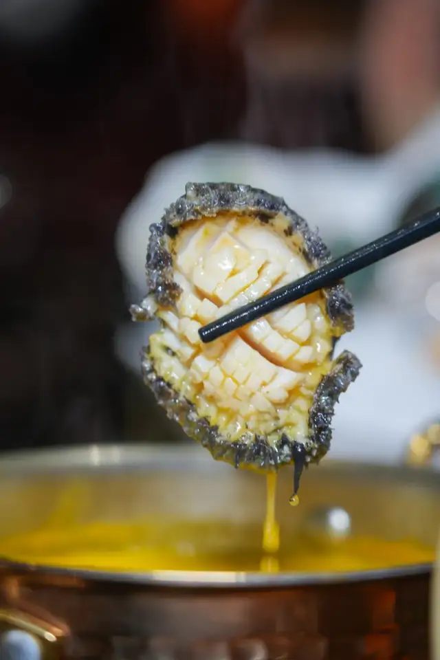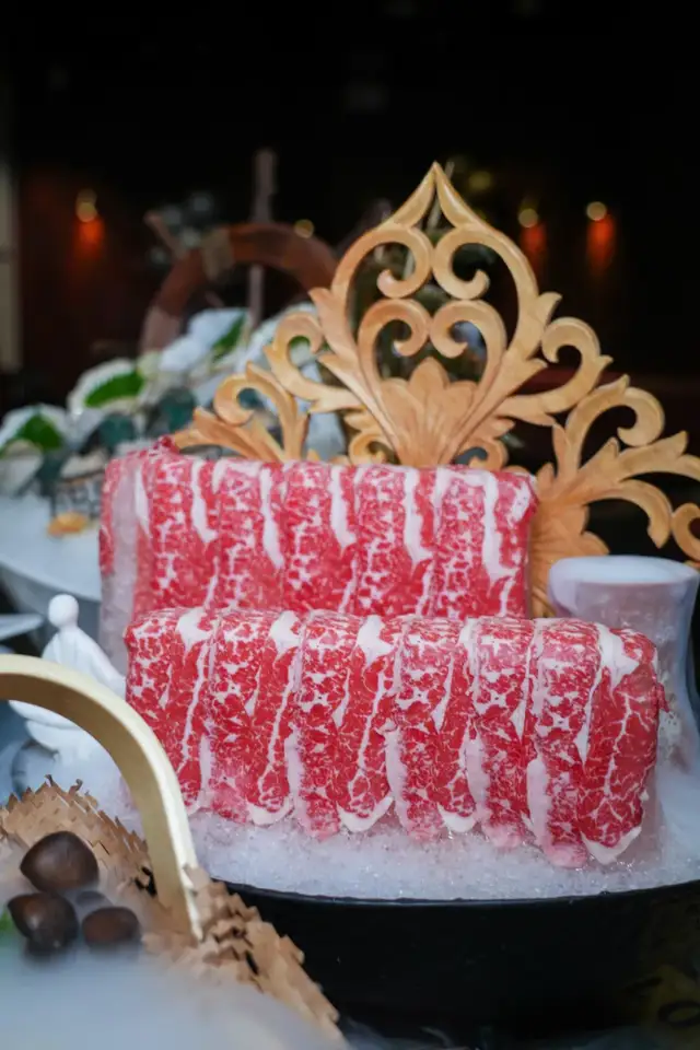 而除了海鲜,涮火锅的肉类,自然和寻常的火锅也不一样:有宴请尊贵客人时刻可选的澳洲和牛、在花胶鸡汤锅里变色即食,奶香味浓郁!