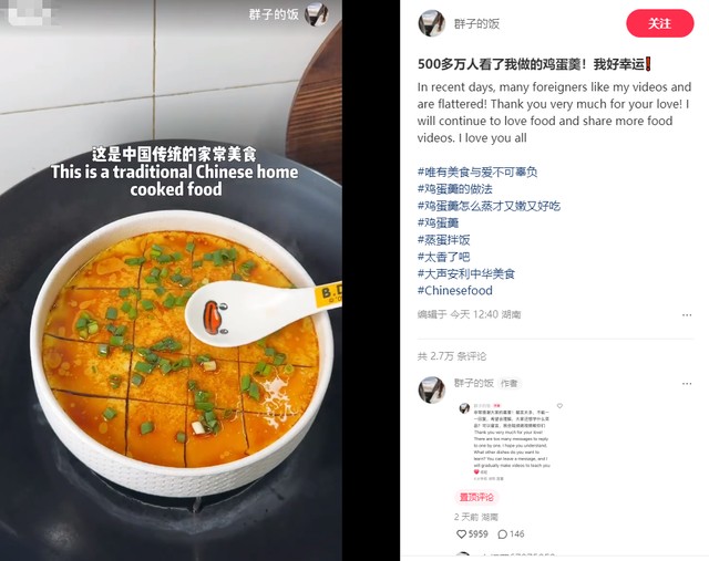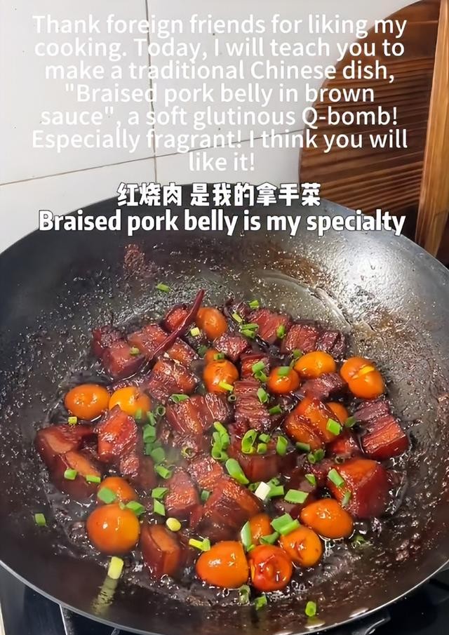目前,“群子的饭”最新分享了,中英双语版的“红烧肉教程”,很多老外已经跃跃欲试。