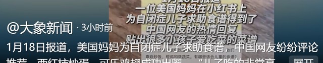 【4】大象新闻,“1月18日报道,美国妈妈为自闭症儿子求助食谱,中国网友纷纷评论推荐,西红柿炒蛋、可乐鸡翅成功出圈,“儿子吃的非常高兴!谢谢大家””.