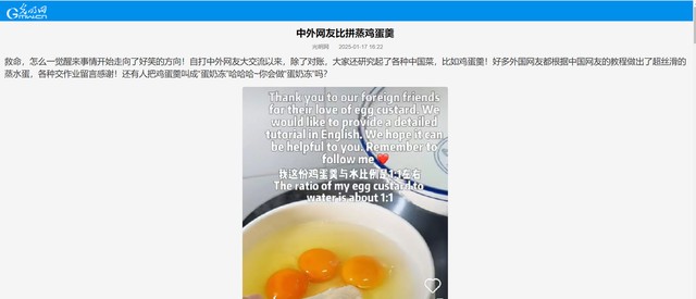 【3】光明网,2025-01-17,“中外网友比拼蒸鸡蛋羹”.