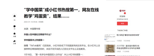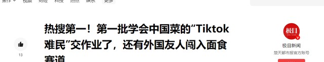 【1】极目新闻,2025-01-08,“热搜第一!第一批学会中国菜的“Tiktok难民”交作业了,还有外国友人闯入面食赛道”.
