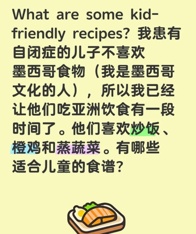她表示,自己儿子患有自闭症,不喜欢墨西哥食物,但却很喜欢炒饭之类的亚洲饮食。