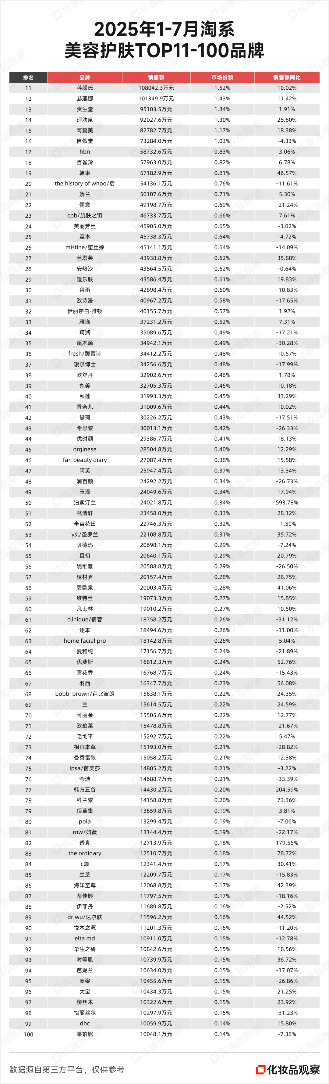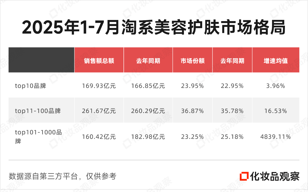 第三方数据显示,2025年1-7月,该平台美容护肤类目中,TOP10品牌销售额平均增速仅为3.96%;而TOP11-100品牌的平均增速达到16.53%,增速差距明显。(TOP101-1000品牌,因有很多新品牌首次进入榜单,增速较大,不纳入比较。)