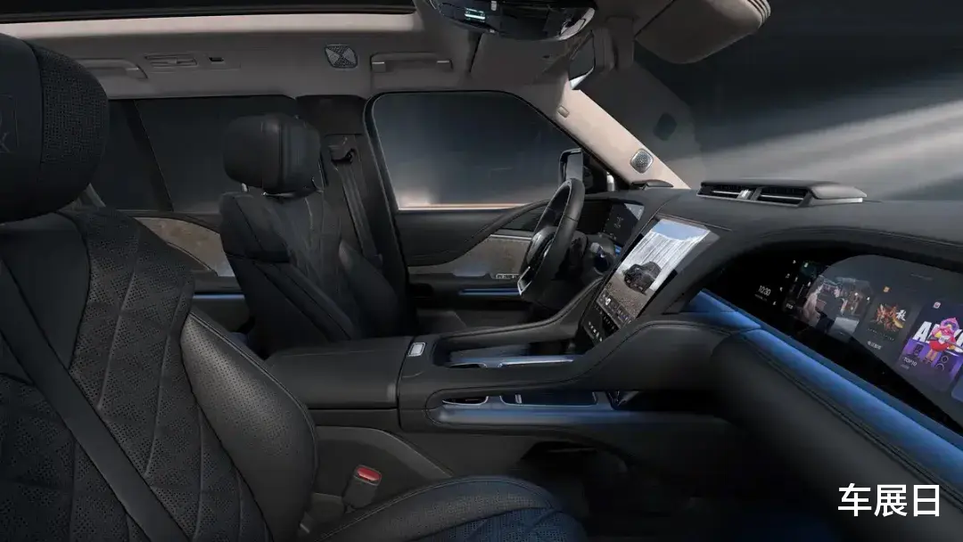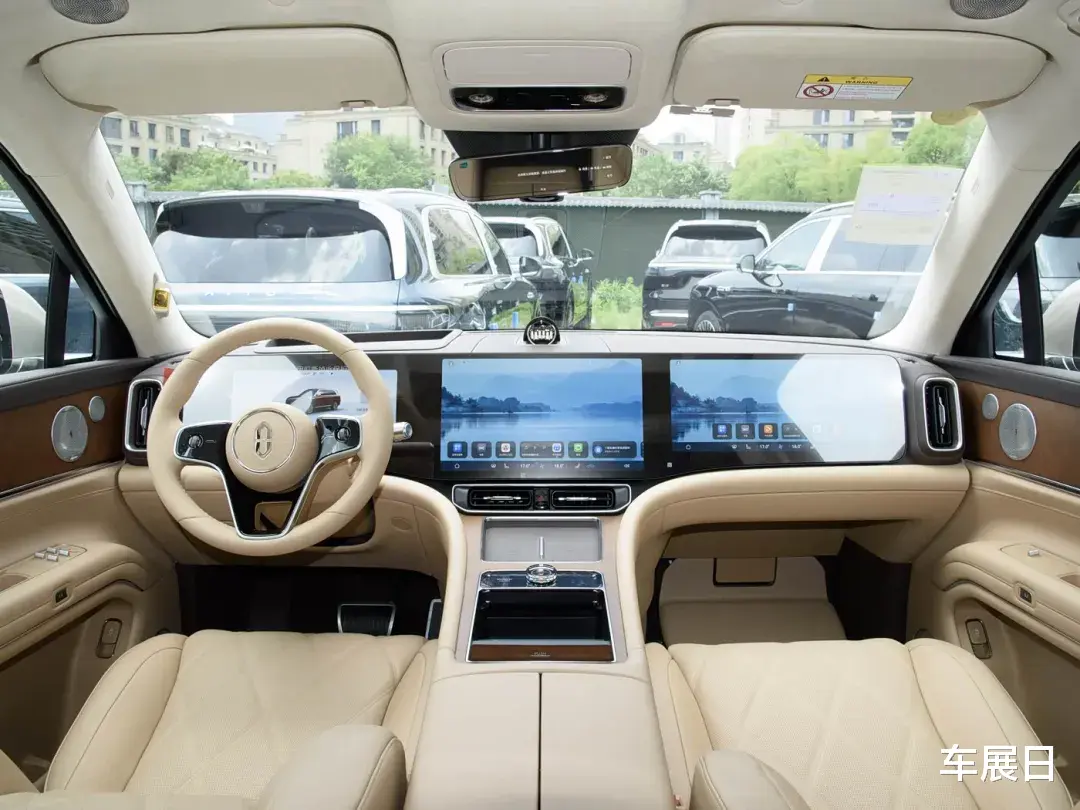 内饰方面,它采用一体环抱式座舱结构,中控台配备双15.6英寸联屏设计,后排还有21.4英寸吸顶娱乐屏,氛围灯总长度达12.8米。