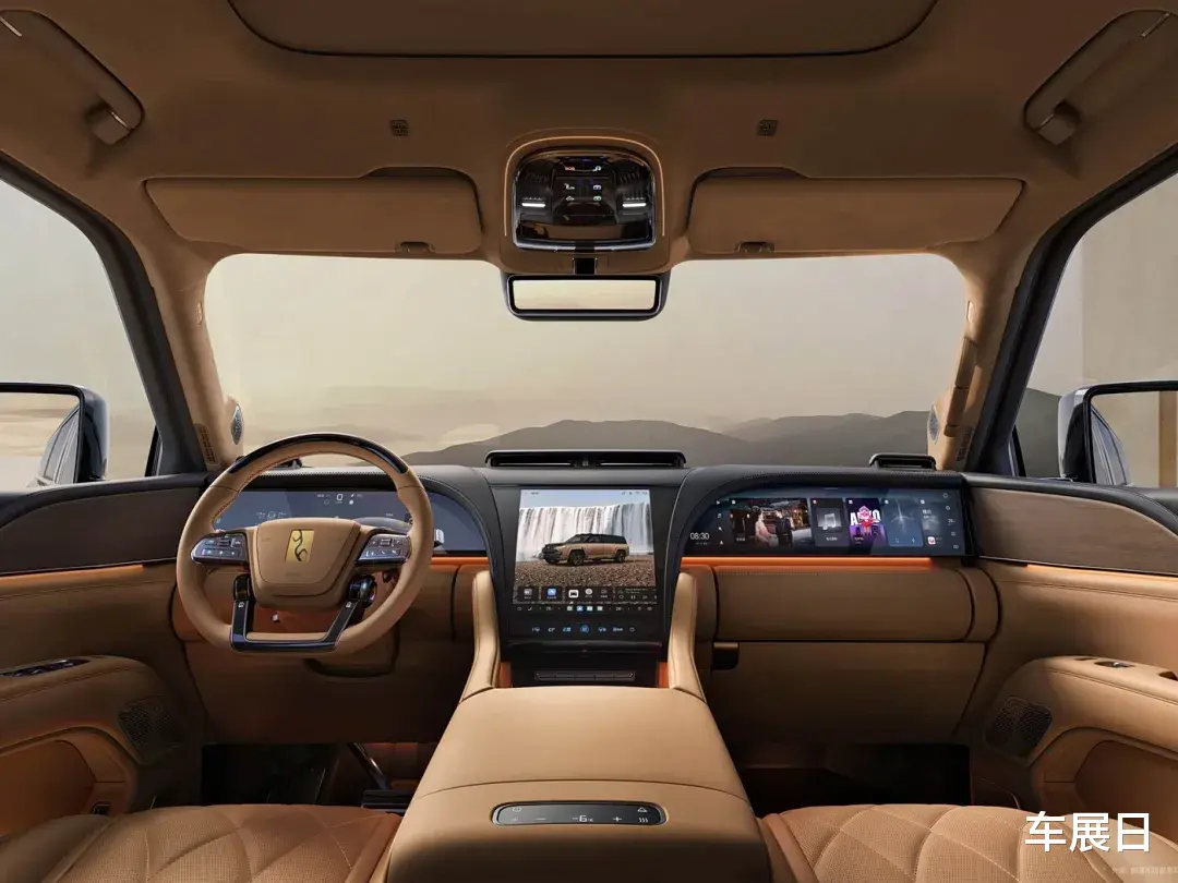 内饰方面,采用星环座舱设计理念,大量曲线设计,大面积皮革包覆,配备12.8英寸曲面OLED屏、23.6英寸仪表屏与副驾娱乐屏,22扬声器丹拿铂金证据系列音响、Nappa真皮座椅等豪华配置。还提供昆仑棕、丹霞橙、烟岚紫、远山灰等内饰配色。
