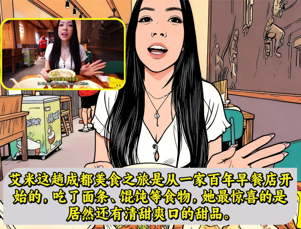 结果呢?从早上七点一直吃到晚上十一点,最后捂着肚子说了句让人捧腹大笑的话,她终于知道中国人为啥都那么苗条了,因为大家每天都得在夜市里走马拉松啊。确实说的有道理,好吃的太多了,不得来回跑。说起来艾米这趟成都美食之旅从一开始就挺有意思的。早上她随便进了一家看着不咋起眼的早餐店,点了肉丝面、手工馄饨等食物。