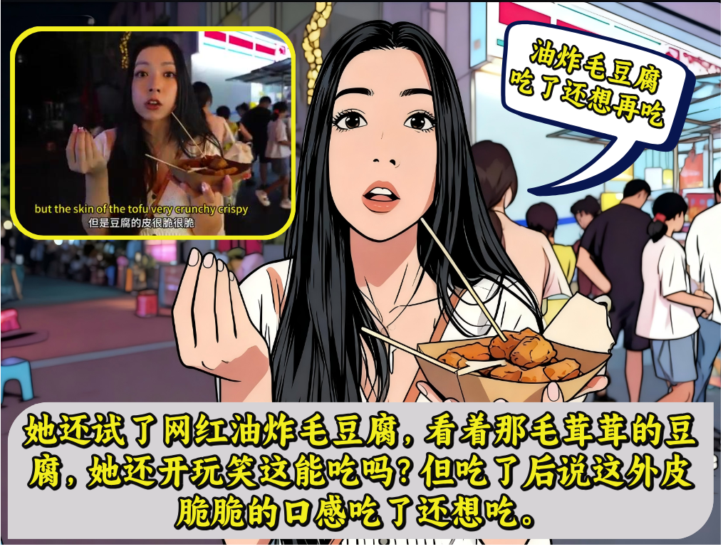 围观的中国食客都乐了。有个大爷拍拍她肩膀:“姑娘,在中国啊,能吃的咱都不浪费。”她还试了网红油炸毛豆腐,看着那毛茸茸的豆腐,她还开玩笑这能吃吗?