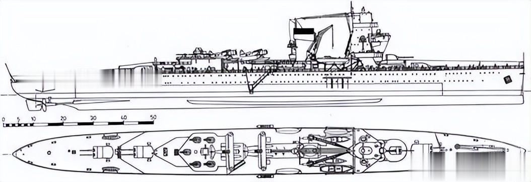 除强大的主炮外,其设计武备还包括六座双联装40毫米博福斯高炮、四座双联装12.7毫米高射机枪、两座三联装533毫米鱼雷发射管以及两架水上飞机。