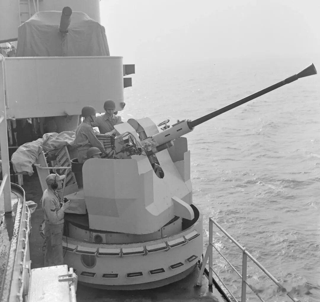 八门博福斯40毫米/70倍径单管高射炮,分布于上层建筑两侧的带护盾炮位。这是战后博福斯40毫米炮的最新发展型号,射速约每管每分钟300发,是末端防空的主要屏障。