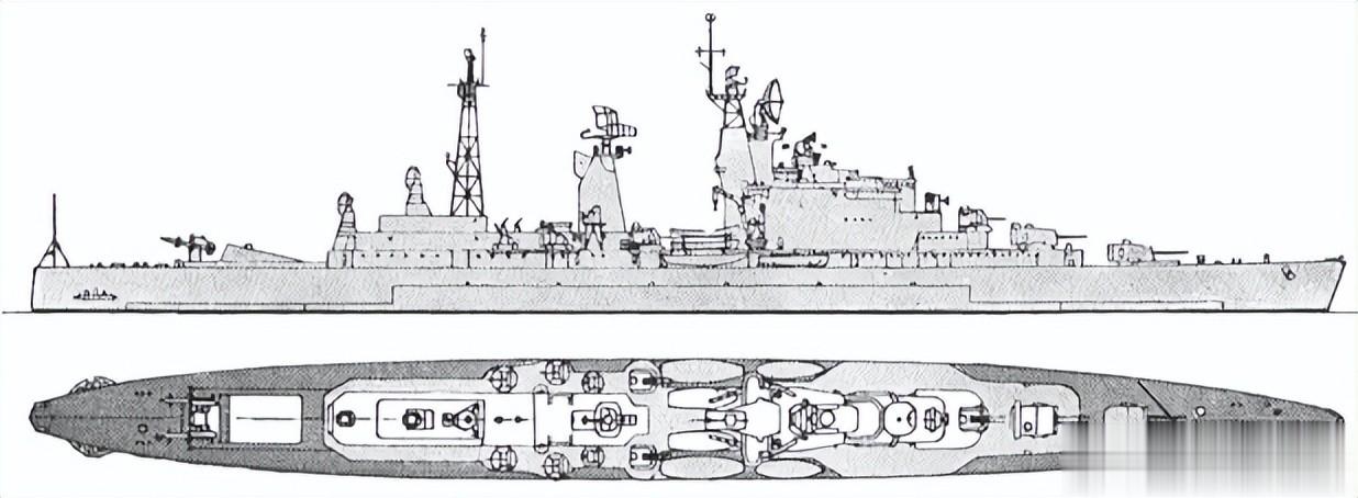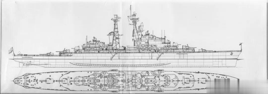 舰体全长187.3米,宽17.3米。其最显著的外观特征是高大且集成的上层建筑与“烟囱-桅杆”一体化结构(所谓“mack”),旨在支撑重型雷达并为旗舰指挥提供充裕空间。防护方面,主装甲带厚度为50-75毫米,甲板装甲为20-30毫米。