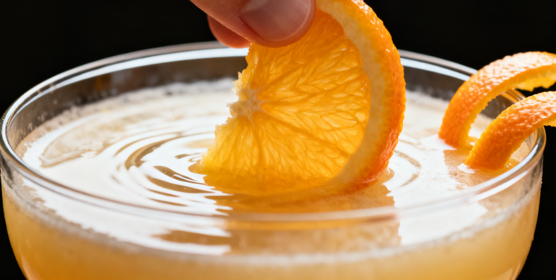 3.放入一片橙子橙皮的香与白酒的清香完美融合,一口下去,清新、果香、微醺交织——这就是“秋日清风”的灵魂。