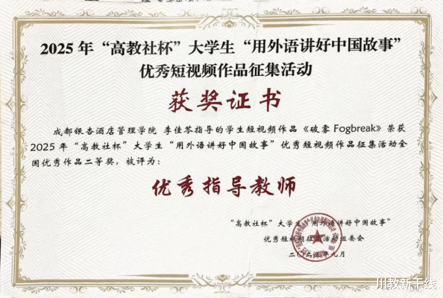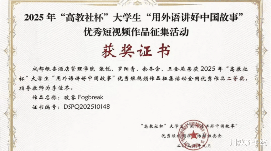 在近日举行的2025年“高教社杯”大学生“用外语讲好中国故事”优秀短视频作品大赛中,成都银杏酒店管理学院学子作品《破雾》(Fog break)荣获本科组省赛一等奖、国赛二等奖。