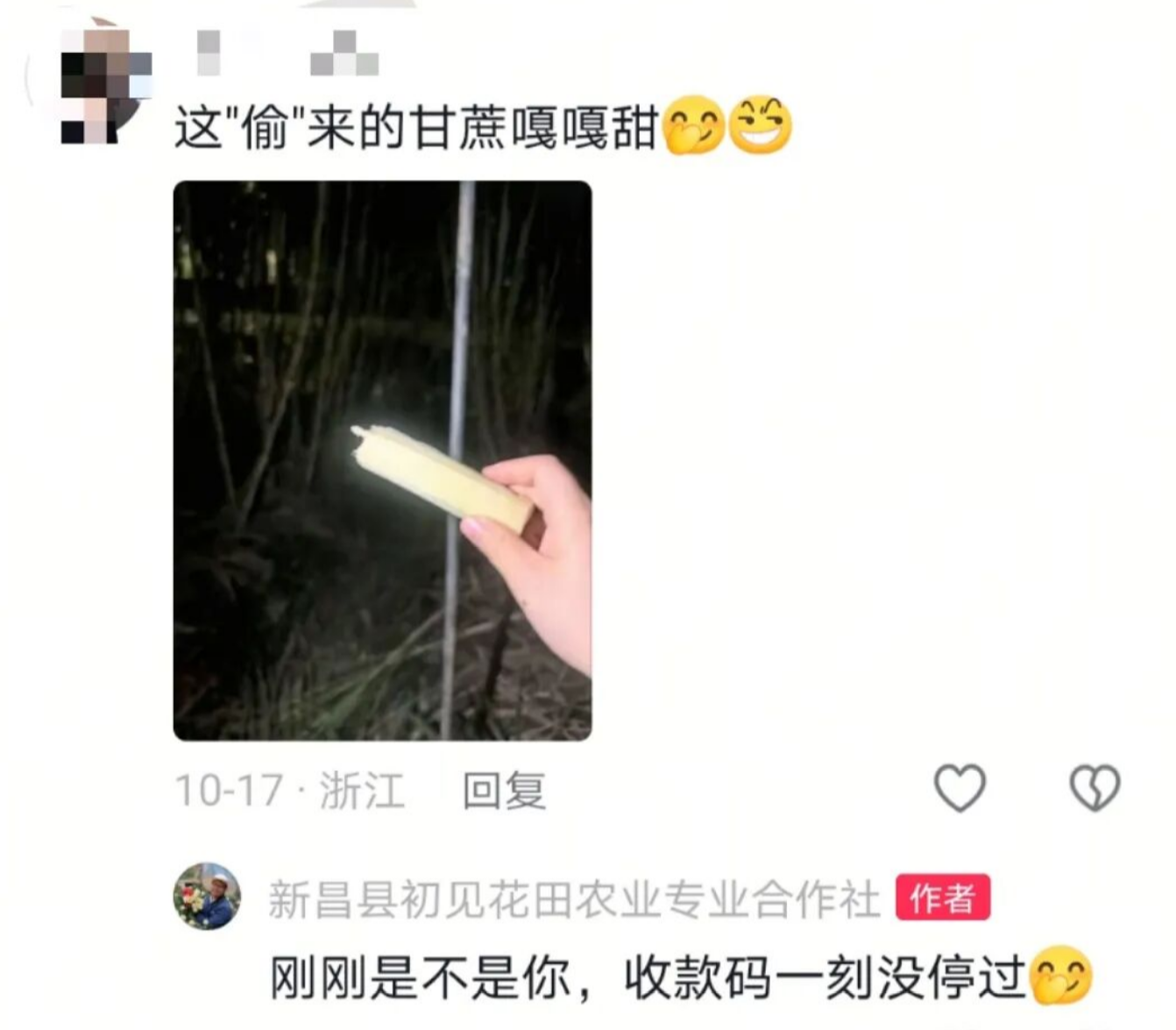 令人惊喜的是,这个看似疯狂的想法获得了热烈反响。20多天来,已有超过100人前来体验,王勇龙收到了6000多元的“偷款”。更让他欣慰的是,大多数人都自觉付款,甚至有人在评论区分享:“这'偷'来的甘蔗特别甜”、“付一根吃三根,体验超值”。