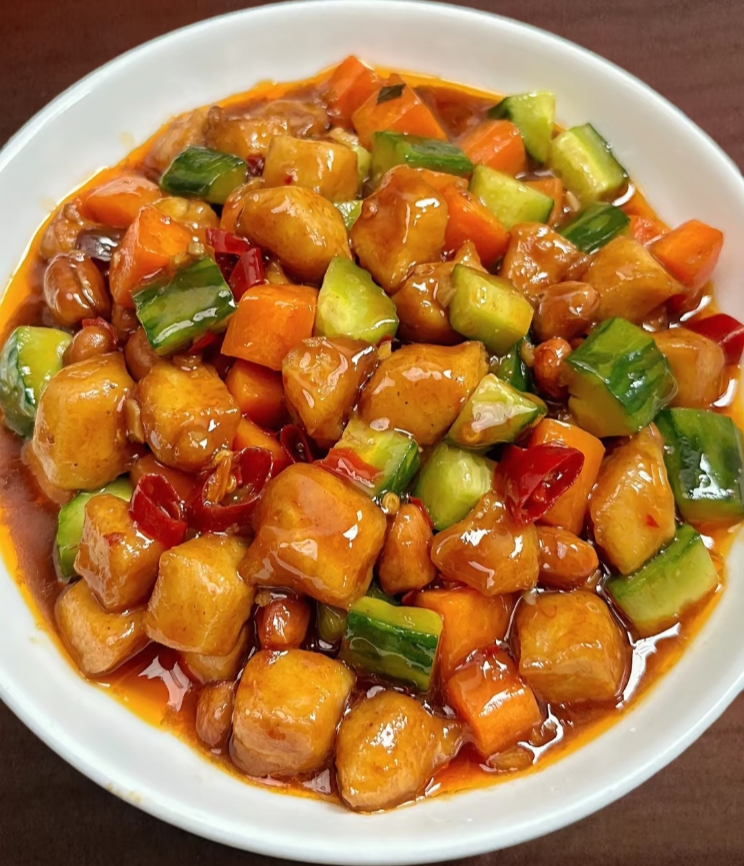 先下胡萝卜丁翻炒1分钟,再放黄瓜丁炒30秒。倒入鸡丁和调好的酱汁,开最大火快速翻炒,待酱汁变得透亮时,最后撒入花生米翻两下即可出锅。记住!花生米一定要在关火前30秒加入,才能保持酥脆口感。