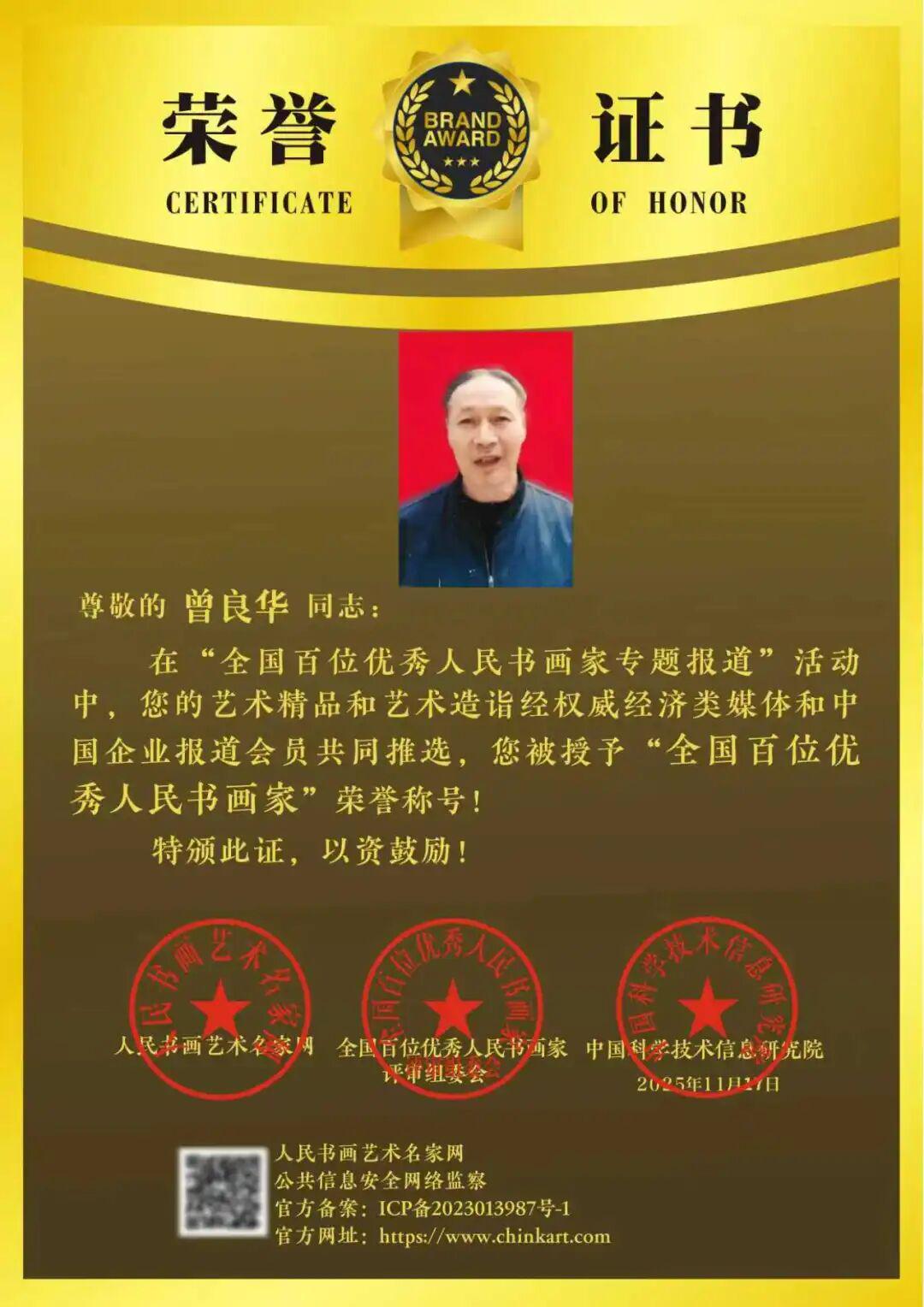 曾良华,汉族,户籍地新疆昌吉市,一九五八年八月十八日出生于湖北武汉黄陂区曾家河村。一九九零年毕业于新疆教育学院美术系,国画山水师从张大千大师的弟子牧歌老师,国画人物师从邹光宁老师,水粉师从王建武老师,水彩师从余然老师,素描和油画师从刘英奎老师,刘建新老师。毕业后在新疆石河子一四四团一中任美术教师,一九九三年人才交流到新疆昌吉市任美术设计部经理。现已退休。二零二一年参加全国书画大赛荣获一等奖,在厦门国际会展中心参加展出的写意人物《校工》经专家评审荣获金奖!国家一级美术师、东方研究会社会员兼顾问。