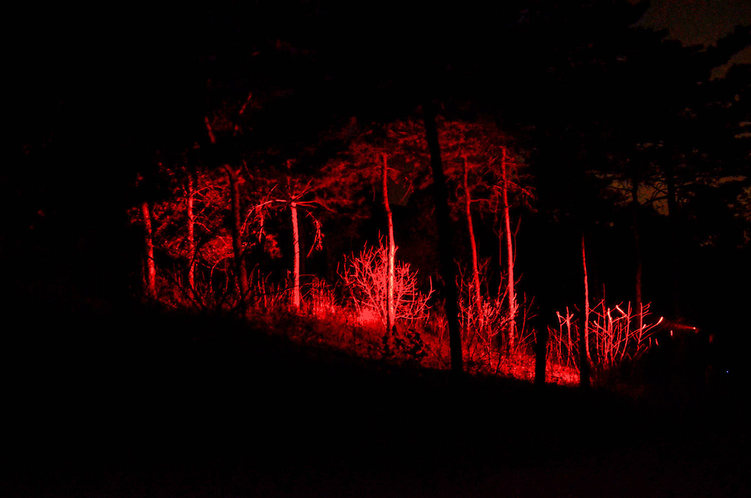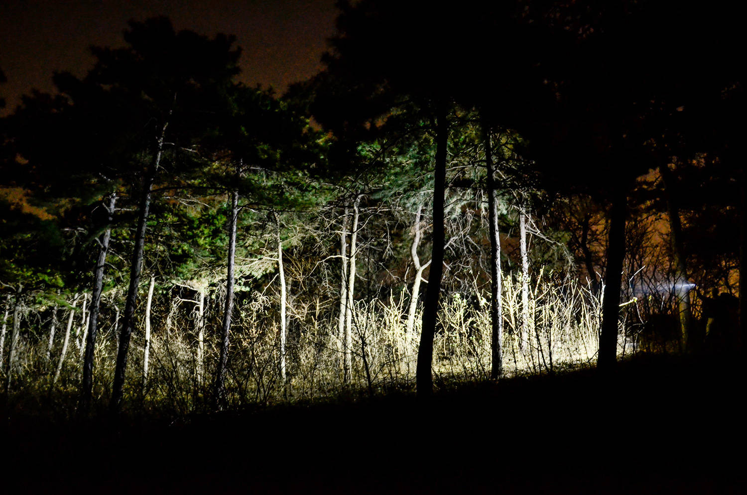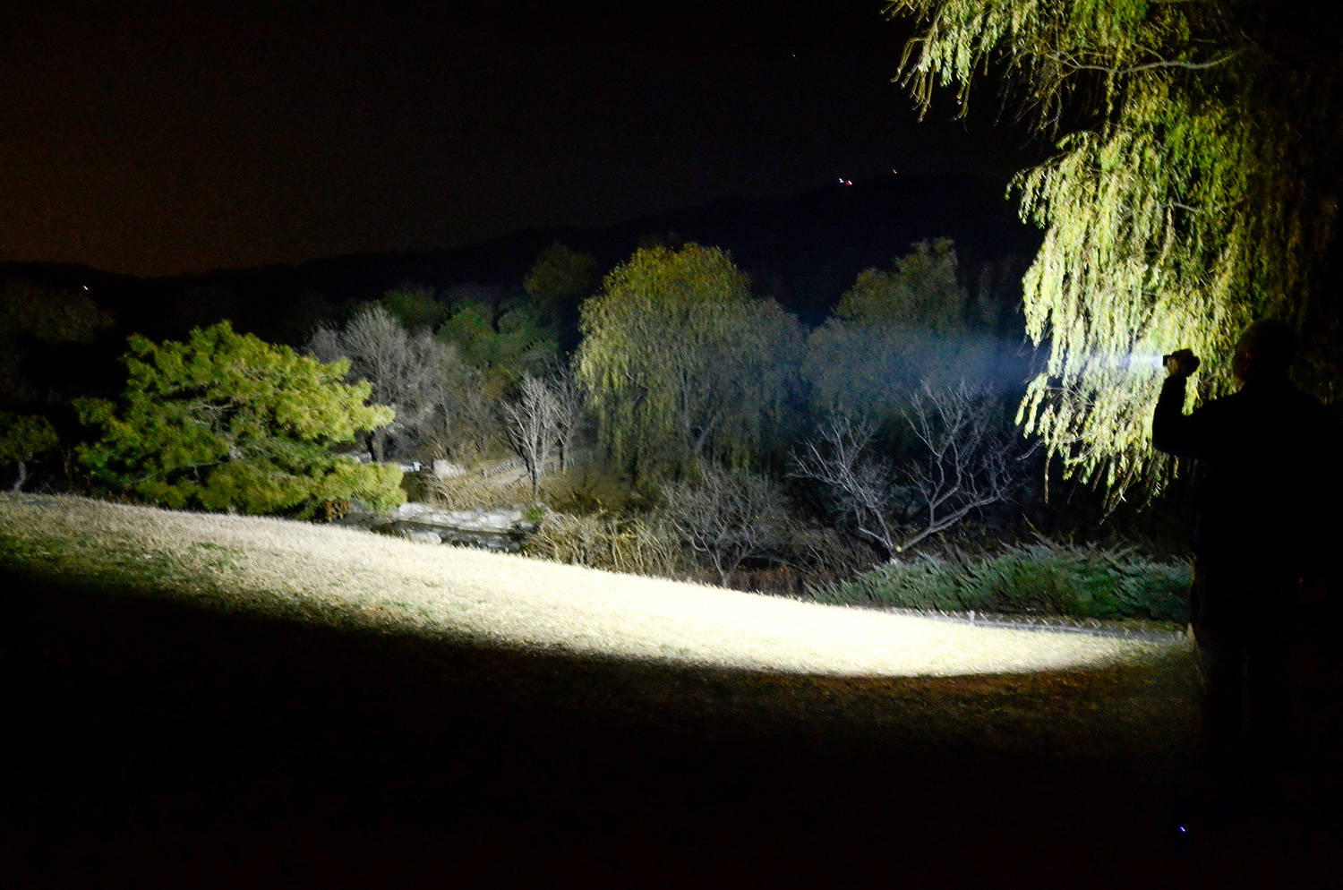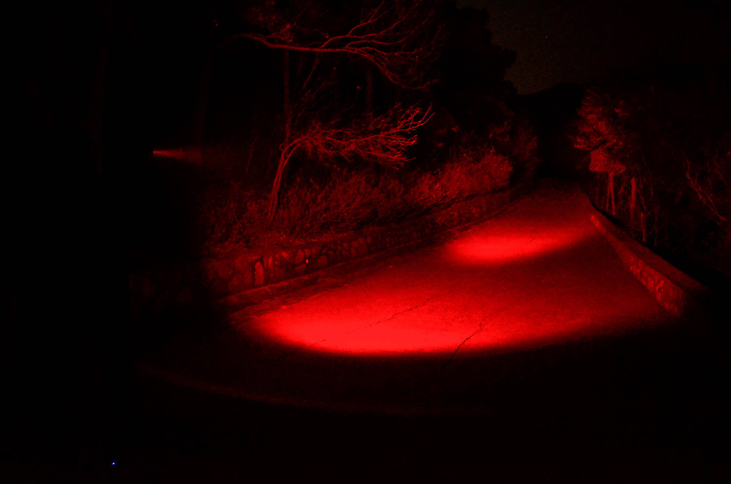 通过下面空旷户外环境使用中和白光的亮度对比动态图,可以看出TK28R的红光照明,绝对具有实战、实用的效果,给黑夜一点“颜色”看看。
