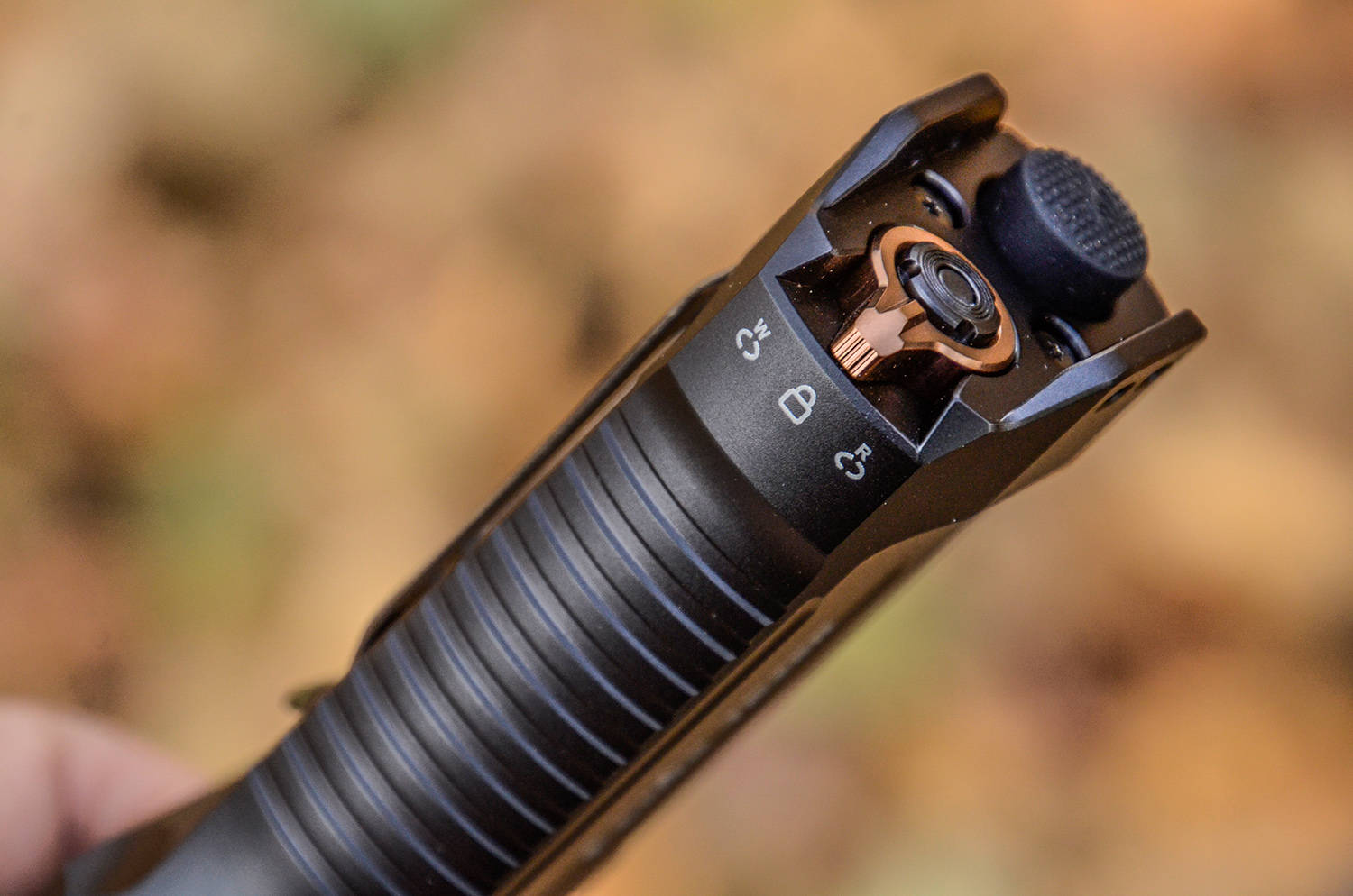 TK28R作为旗舰款战术手电,单手可以灵活操作,握满手电筒身,拇指就能轻松搭在尾部,而且可以轻松在三个开关之间切换,以实现不同的发光功能,开关表面都有防滑纹路,按键手感反馈清晰准确,操作灵活方便。