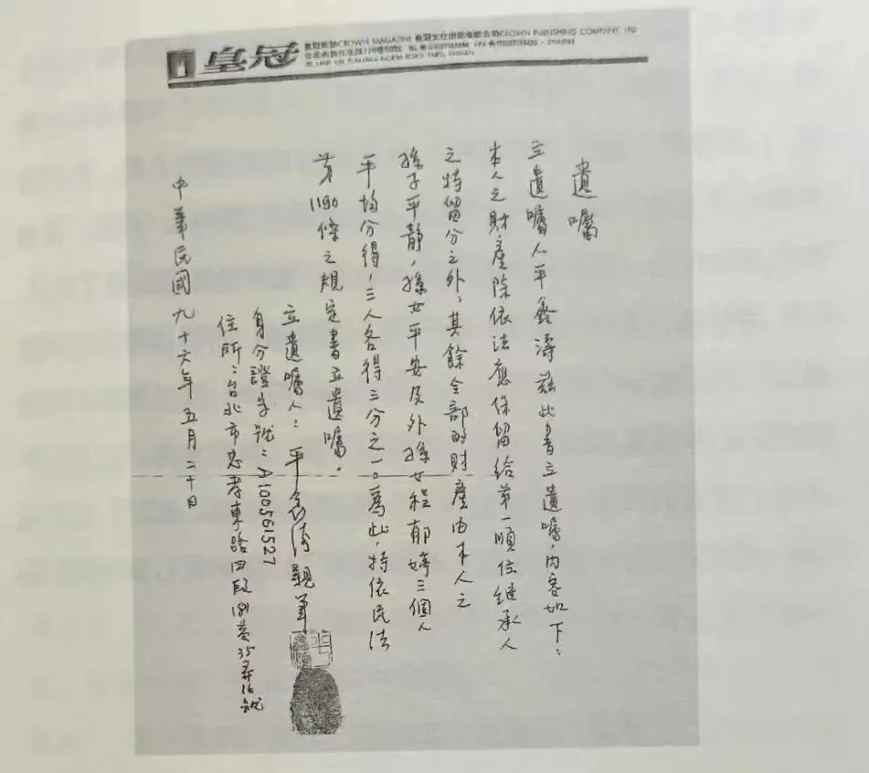 但是对平鑫涛去世后三天,他的三个儿女,却拿出了他2007年亲笔写的遗书。