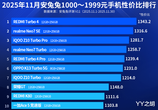 具体来说,在安兔兔2025年11月份1000—1999元手机性价比排行榜中,REDMI Turbo4和realme Neo7 SE分列第一名和第二名。在安兔兔平台上,这两款智能手机的性价比评分分别为1343.2分和1316.6分。其中,REDMI Turbo 4这款智能手机首发天玑8400- Ultra处理器。该处理器基于台积电 4nm工艺打造,全球首发 Cortex-A725大核,包括 1×3.25GHz A725核心、3×3.0GHz A725核心以及 4×2.1GHz A725核心,全大核架构设计。