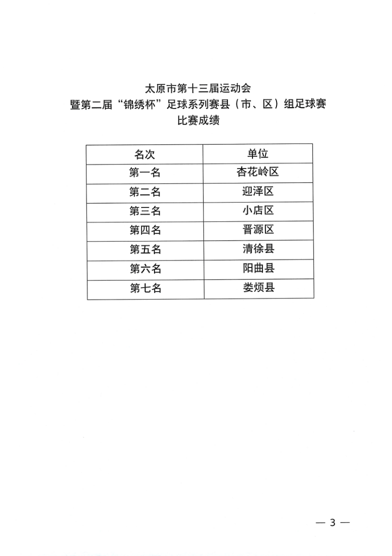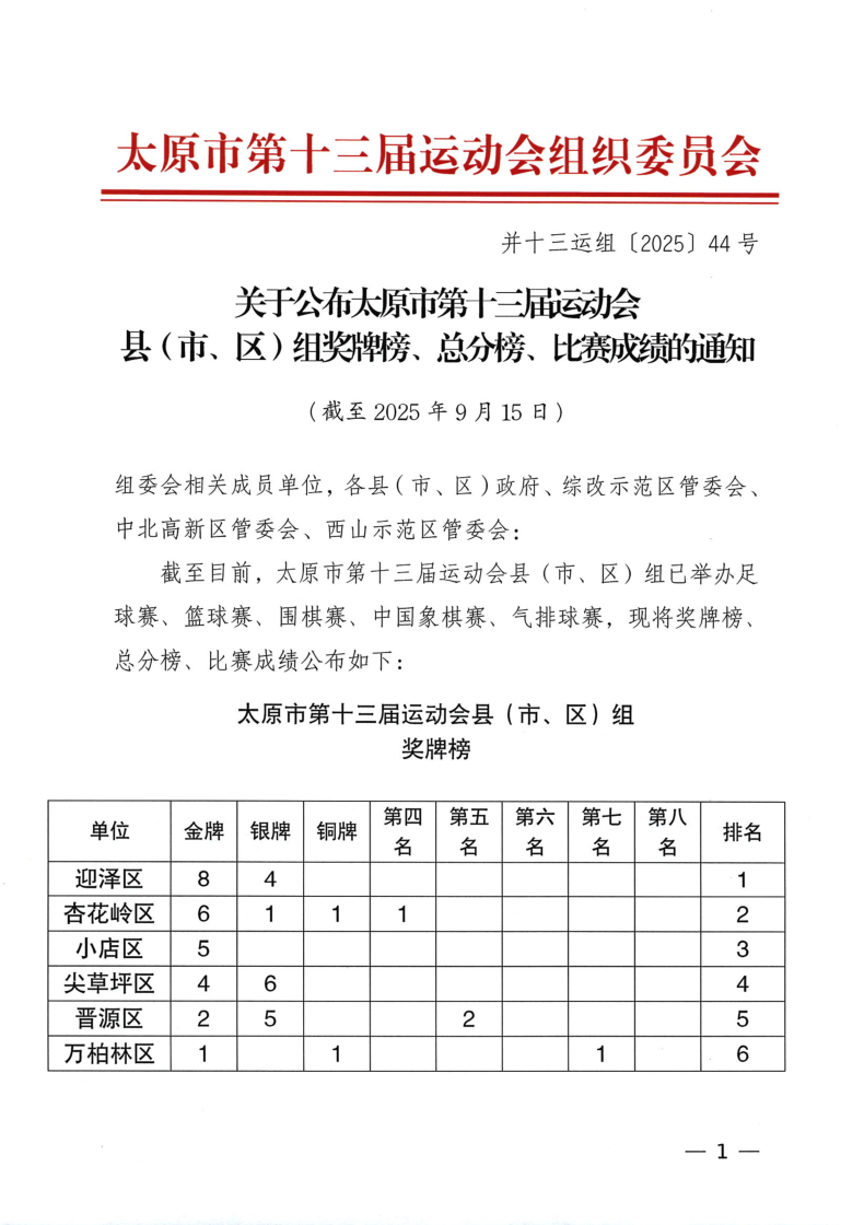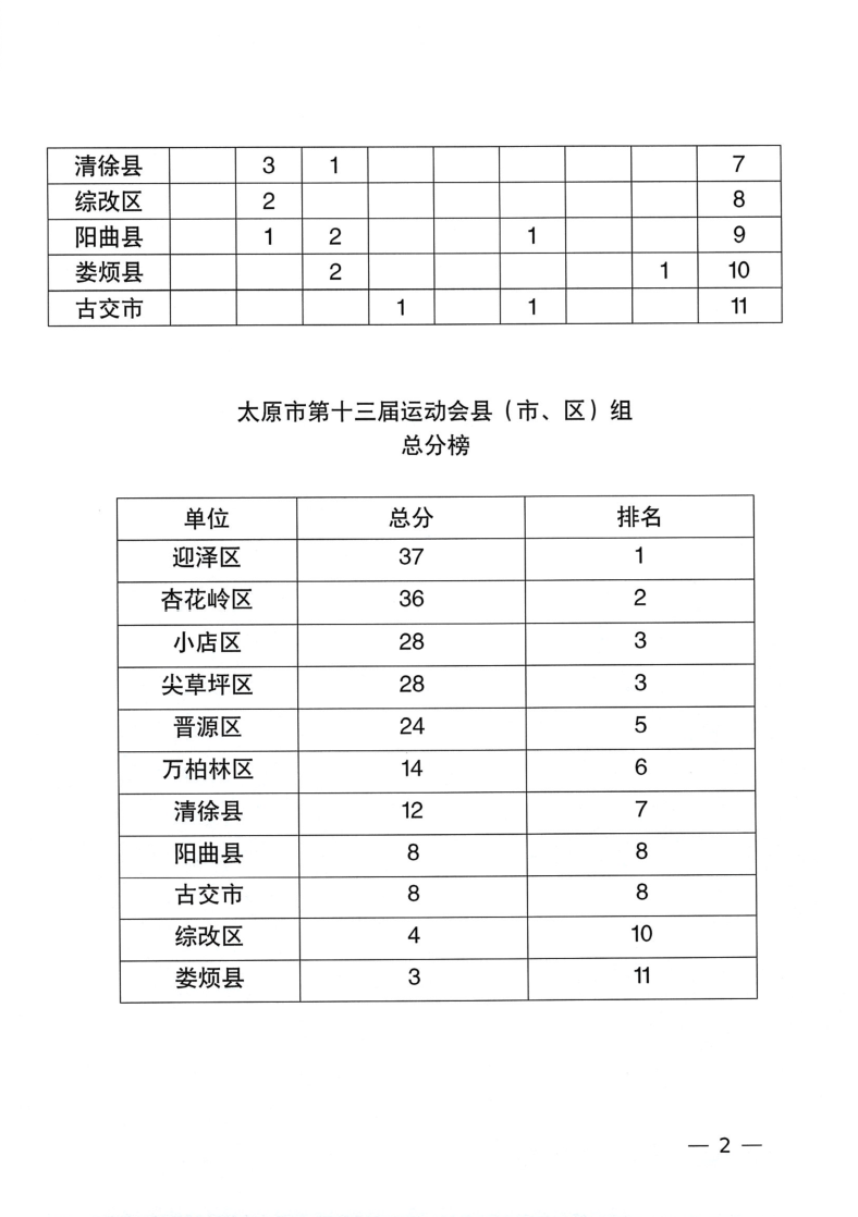 【市运会】关于公布太原市第十三届运动会县(市、区)组奖牌榜、总分榜、比赛成绩的通知