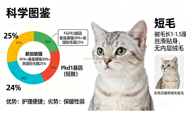 从新加坡猫继承FGFR3 基因的弱表达突变,该基因负责调控骨骼发育,弱表达可使躯干骨骼长度缩短约 20%,但不影响骨骼密度;