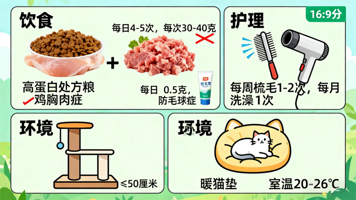 饮食需求消化系统脆弱且代谢速率快,需选择高蛋白(≥32%)、低脂肪(≤15%)的小分子处方粮,每日喂食 4-5 次,每次 30-40 克,避免一次性过量喂食导致低血糖。可每周搭配 1-2 次鲜食,如蒸熟的鸡胸肉碎、三文鱼泥,补充 Omega-3 脂肪酸增强被毛光泽,但需避免喂食肝脏等高蛋白食物,以防代谢负担。因舔毛频率高,需每日喂食化毛膏(0.5 克),预防毛球症。