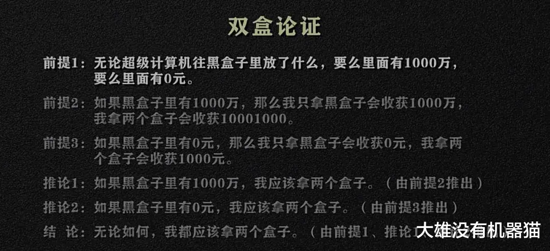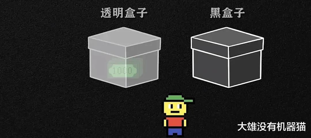 在你面前摆放着这样两个盒子,一个是透明的白盒,能看到其中之物,一个是不透明的黑盒,对里面的情况一无所知。白盒里放着一千元现金,而黑盒里有可能放着一千万的支票,实验要求你要不拿走一个黑盒,可能就会有一千万,要不就两个盒子一起拿走,白盒里的一千是注定会得到的,而黑盒子有可能在你选择一起拿走时,里面变得空空如也。实验有个前提设定是这样,决定黑色盒子里有无巨款的是一台超级计算机,能算出你的所有行为和决定。早在很久之前,就对你今天会选择哪个盒子做出了预测,假如你选择只拿走黑盒,里面会有计算机早早就算出来你会拿走这一个盒子,而提前准备好了一千万。如果你要选择将两个盒子都带走,白盒里的一千肯定百分之百能拥有,但黑盒里可能就会空无一物。