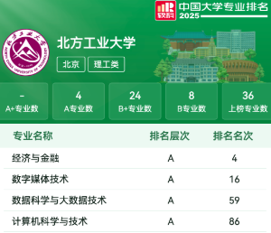 北方工业大学:工科门类更为齐全,计算机科学与技术、机械工程等传统工科有一定实力,在软科专业排名中有4个A类专业,但信息科技类专业的整体竞争力弱于北信科,且学科精度与信息领域的聚焦度不足,在数字经济时代的行业适配度稍逊一筹。